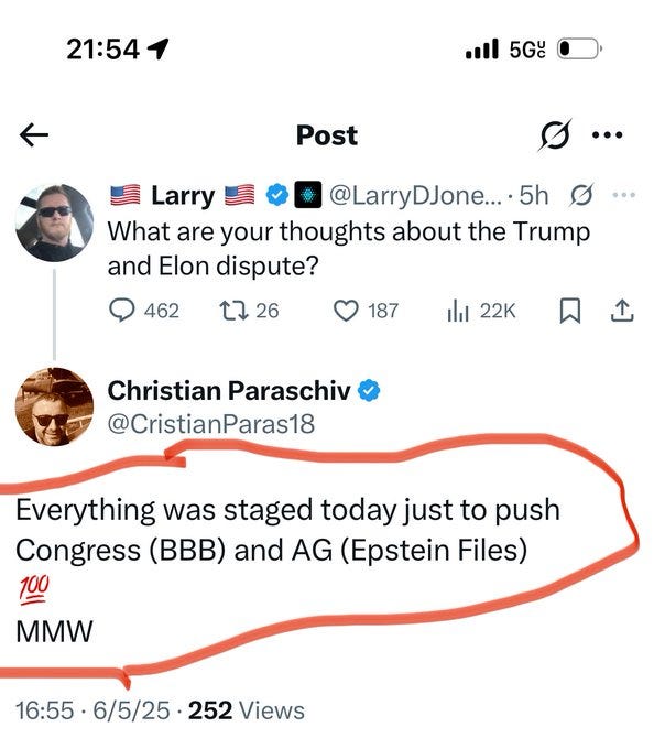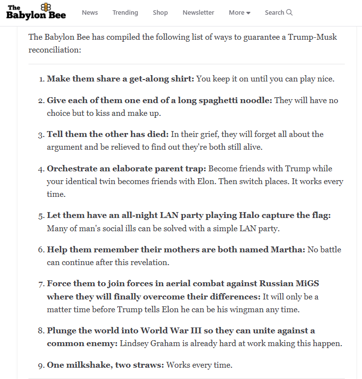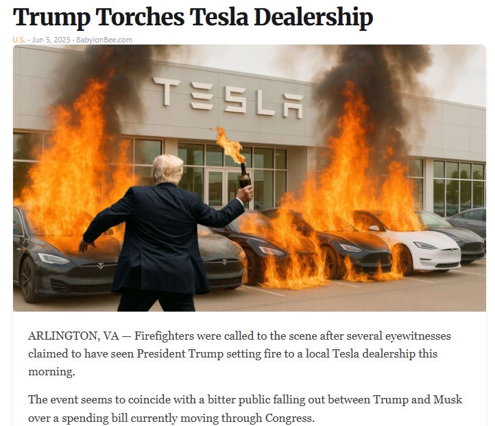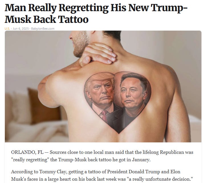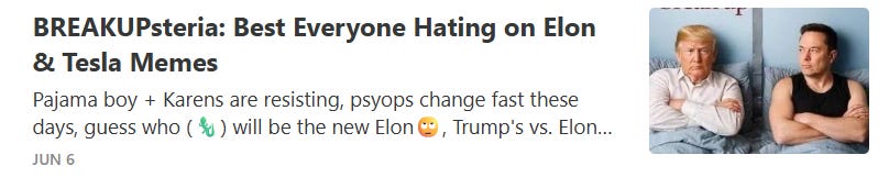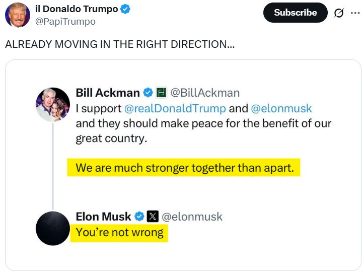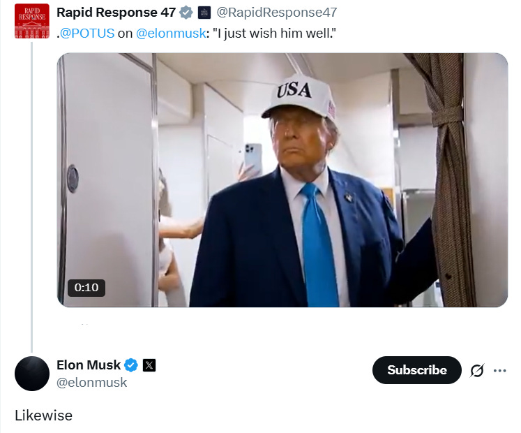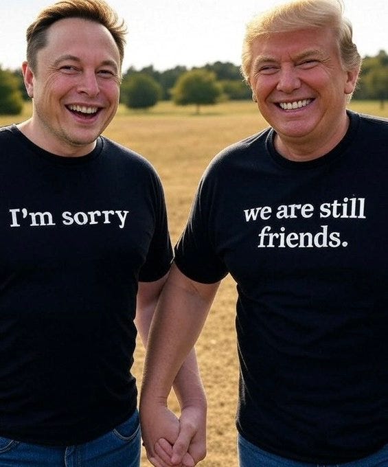 The Elon vs. Trump war that flared up last week appears to be simmering down (just as an insurrection or new summer of love begins in California) - here is a recap: