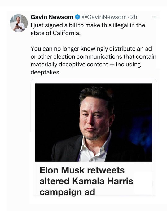 After Elon Musk retweeted a Kamala parody ad, Newsom signed a bill into law effectively banning parody videos and memes: