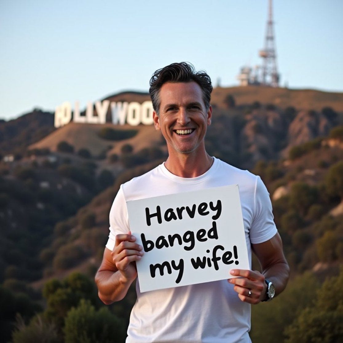 Meme dealer, meme police, Gavito Newssolini, Il Douche, Big Brother approves, remembering when Harvey Weinstein was banging Gruesome's wife and more California deepfake law + AI Newsom memes!