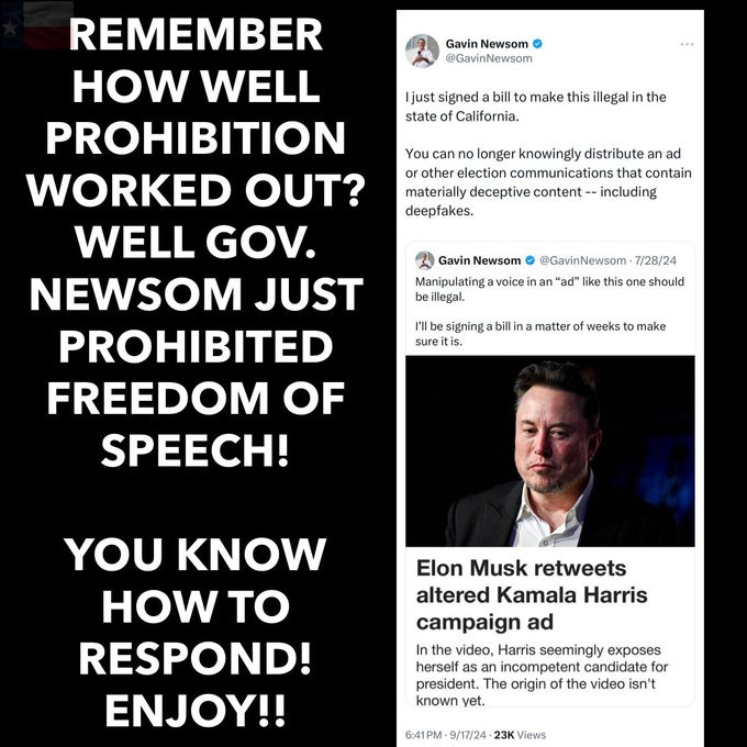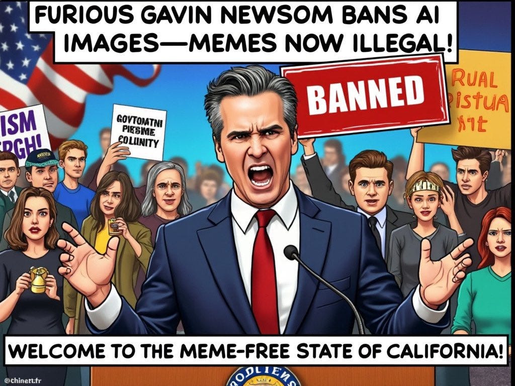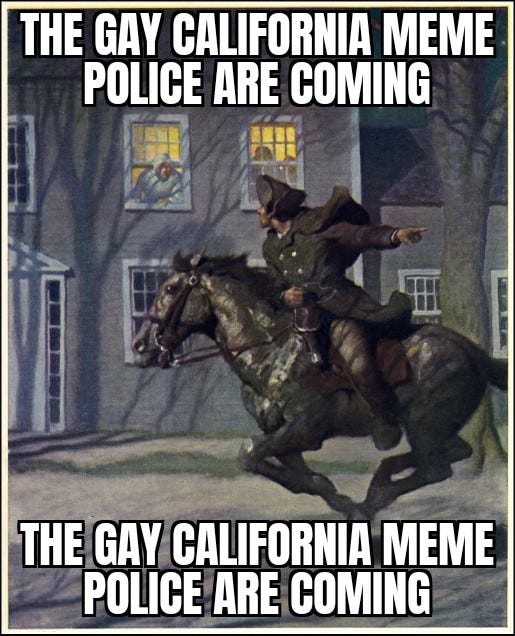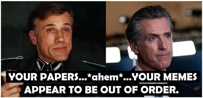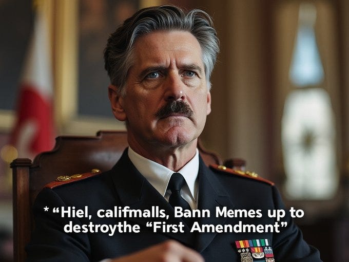 RIP freedom of speech, make parody great again (and legal), the gay California meme police are coming, your memes appear to be out of order and more California deepfake law + AI Newsom memes!