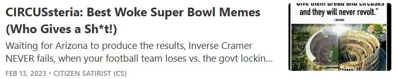 COVIDsteria: An Oral History of America’s Great Reset (Table of Contents) is a fictional satire along the lines of a Studs Terkel oral history or Max Brooks' World War Z published as a serialized book on Substack while Tales From the Great Reset is our occasional satirical short-story series and BREAD&CIRCUSES posts are weekly humor roundups. In addition, check out our Community + Links to Alternative COVID & Great Reset Resources...
