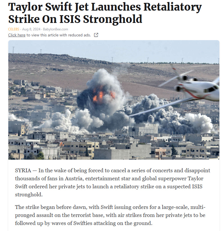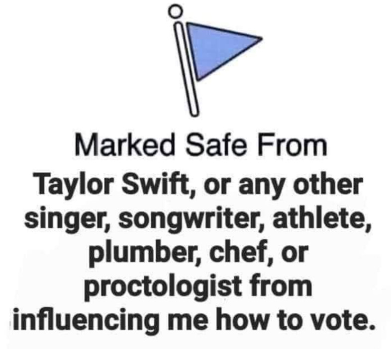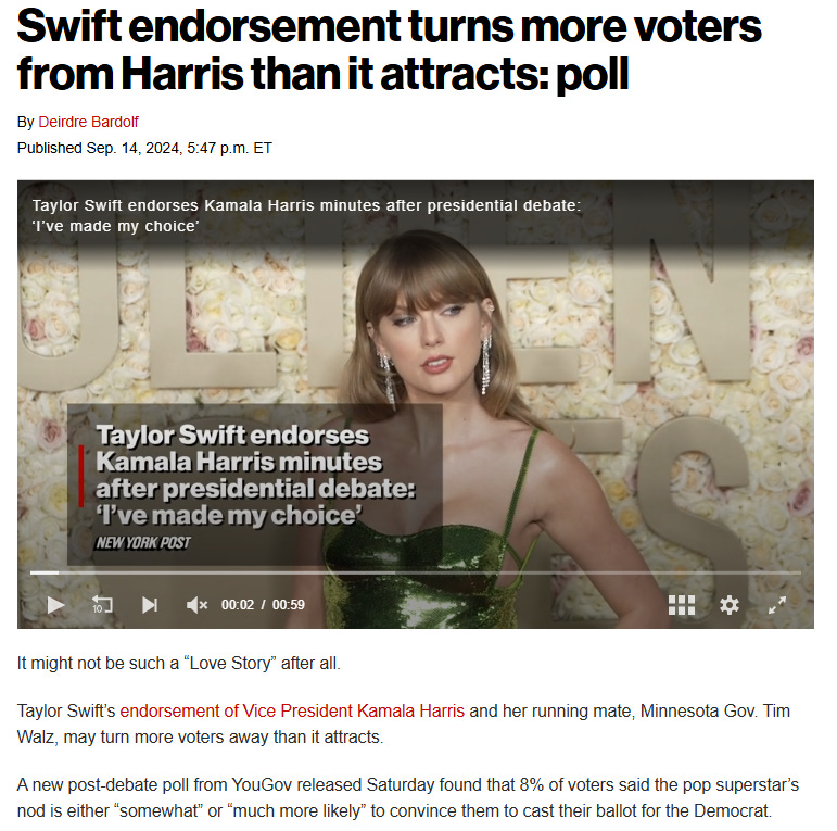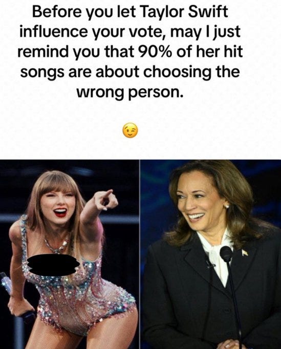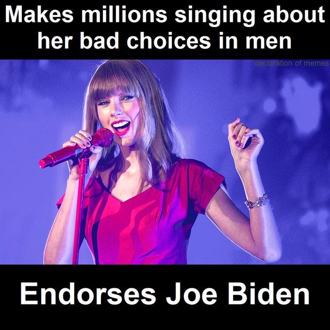 In case you have not heard, Taylor Swift, the psyop singer who sings about bad choices in people, has endorsed Kamala…: