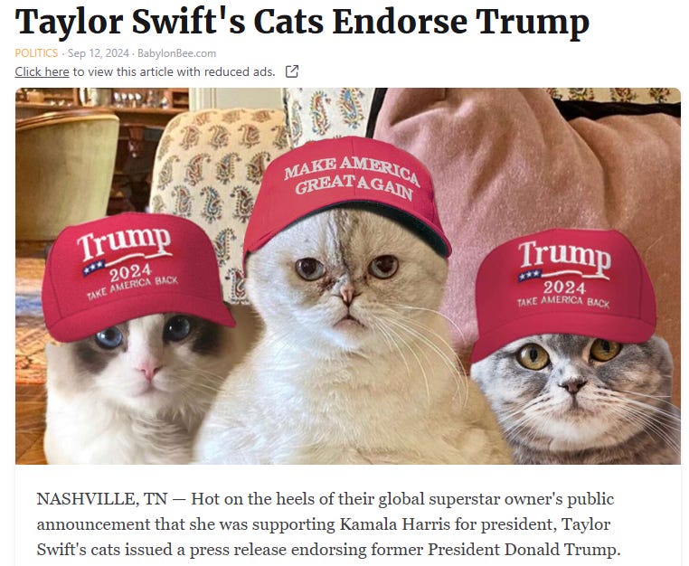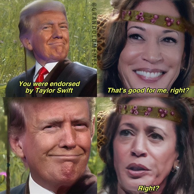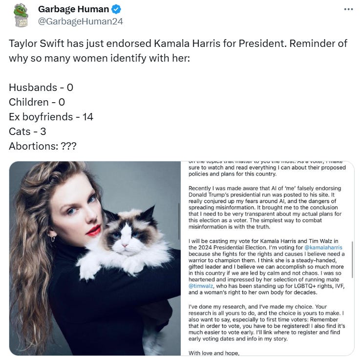 What’s a Taylor Swift political endorsement worth (not much...)? All those private jets, why so many women identify with a childless cat lady and more Taylor Swift memes as she endorses Kamala!
