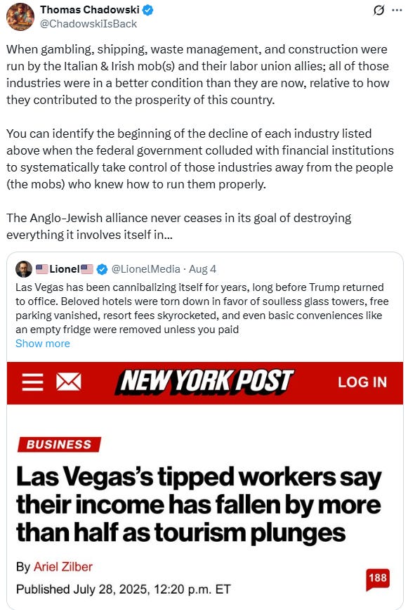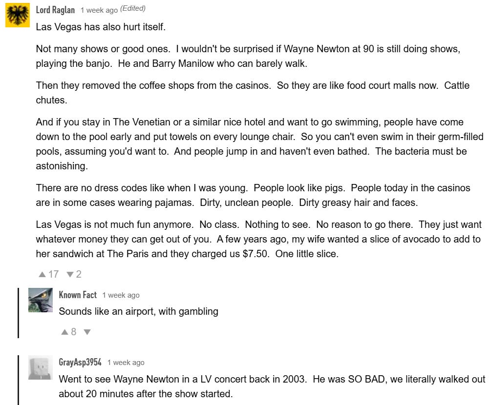 Lawyer Robert Barnes was also recently on The Duran and was asked at the beginning his take on the US economy by first discussing Las Vegas which he noted is also dependent to some degree on international tourism. He commented how Las Vegas used to be run by the Mafia (who I don’t think were as greedy as the current corporate suits/bean counters who run the casinos…) and then by a couple of billionaire oligarchs who are now mostly dead - leading to a corporatized Las Vegas that has become a nightmare for working-middle class Americans where water costs $8…: