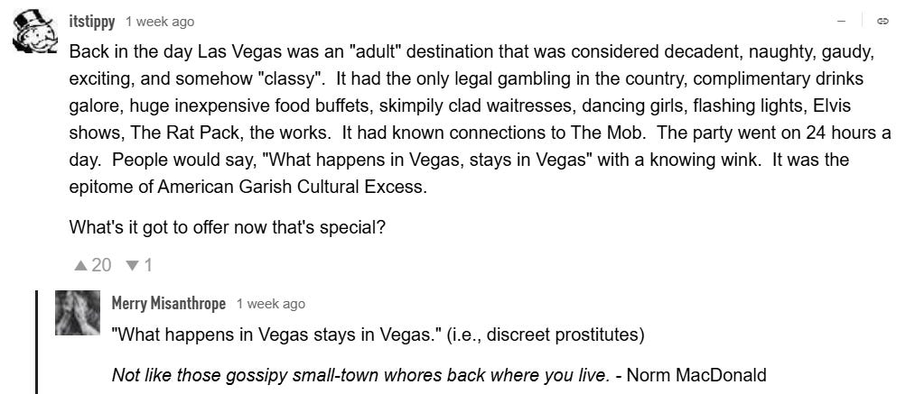 Vegas under the Mob (better looking hookers & odds, free F&B, etc) vs. corporate bean counters ($8 water, $25 minimum tables, $40 parking, $50 resort fees, etc) & more corporatized Las Vegas memes!