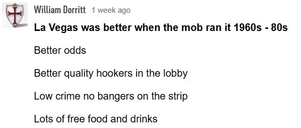 IF anyone has recently been to Las Vegas, lives there or remembers going there in the good ’ol days when the mob or oligarchs ran it vs. today with the corporate bean counter in charge, let us know in the comments: