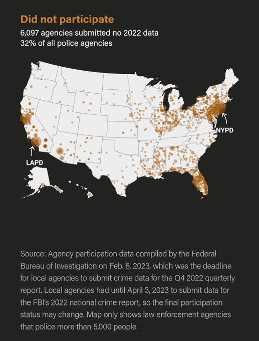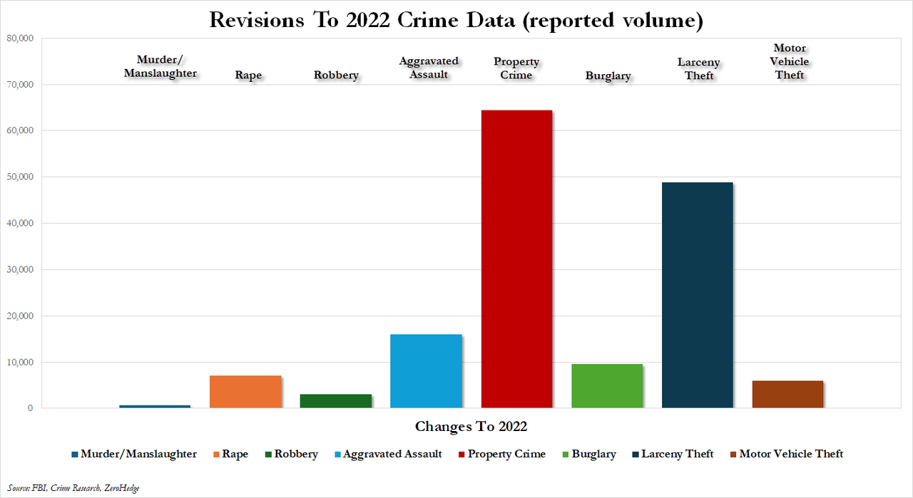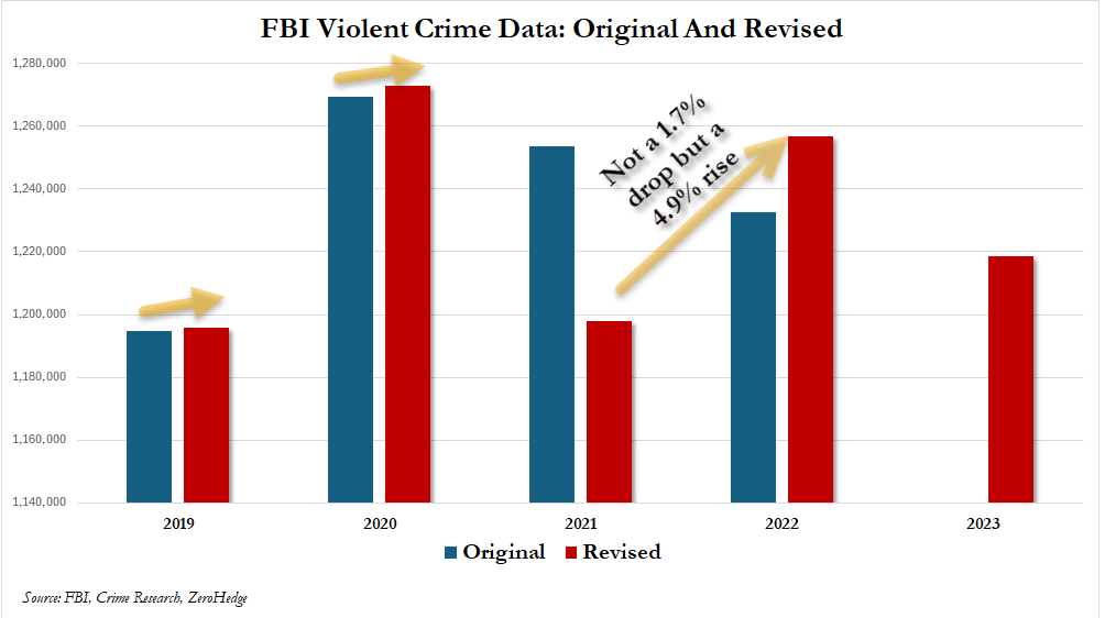 Now we find that the FBI has quietly revised those numbers - and that crime actually increased by 4.5% in 2022 (4.9% in absolute terms)...