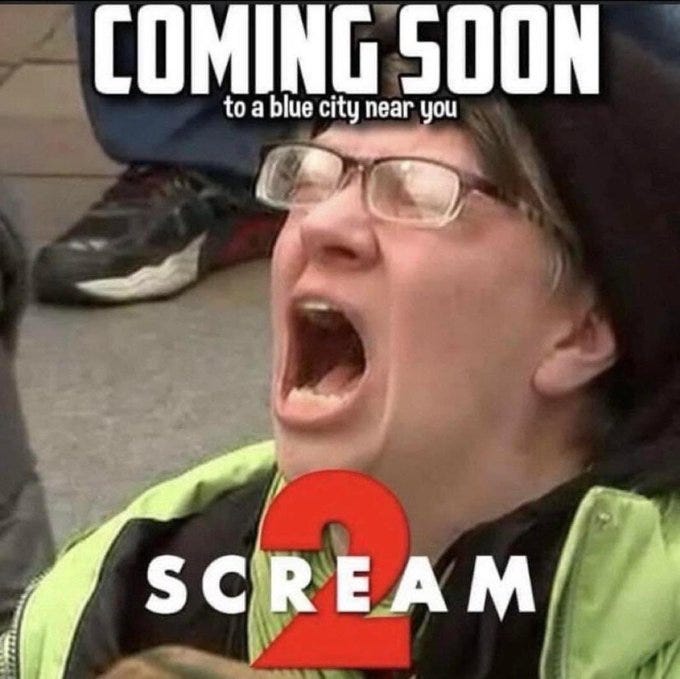 Too big to rig this time, copium, Joy Reid sans joy, let that sink in, guess who is the biggest loser, Scream 2 (coming to a blue city near you), thank you Scott Presler and more election night memes!