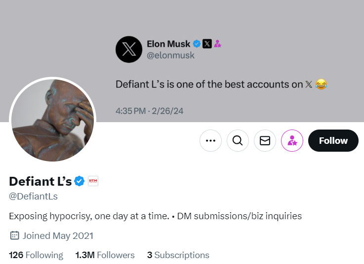 Defiant L's is a great Twitter account that comes up with memes documenting actual liberal hypocrisy and two-facedness (In fact, I think there is a leftwing clone of theirs trying to do the same to non-lefties but I can’t remember who they are):