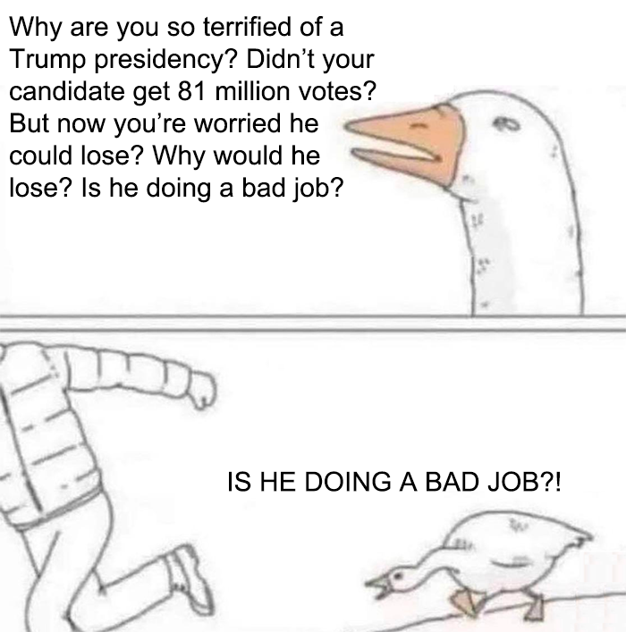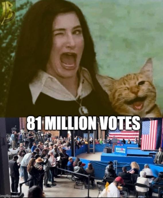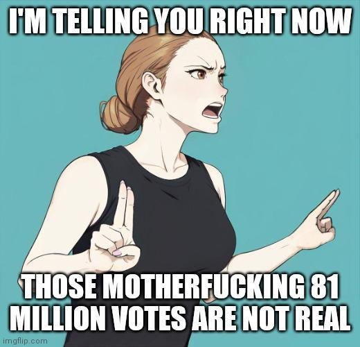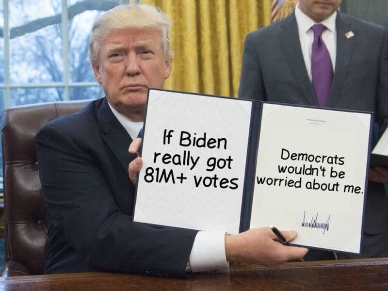 If Dems got 81M votes & are doing a wonderful job, why are they all worried about Trump? Voting (giving grown adults the illusion of control), keep voting harder and more election fraud memes!