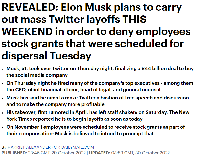 “Obviously, myself and other investors are obviously overpaying for Twitter right now.” Musk in Tesla earnings call, October 19, 2022 (source)