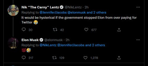 “And no ads. The power of corporations to dictate policy is greatly enhanced if Twitter depends on advertising money to survive.” April 9, 2022 (source)