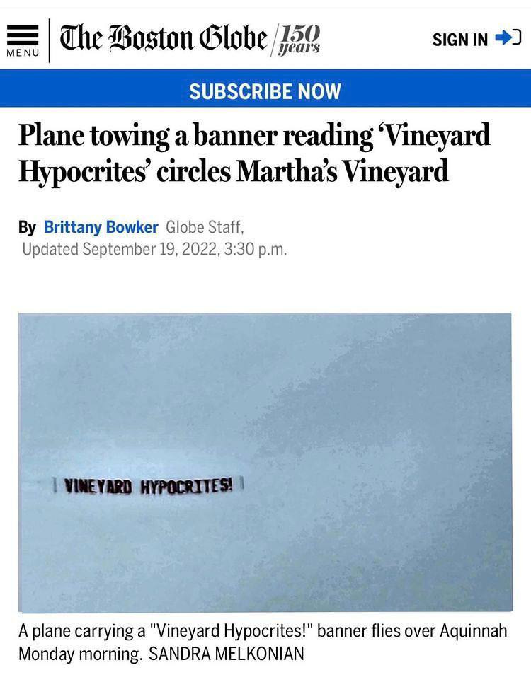 Maybe Martha’s Vineyard residents can be shamed into taking them back - Plane towing a banner reading ‘Vineyard Hypocrites’ circles Martha’s Vineyard - The Boston Globe
