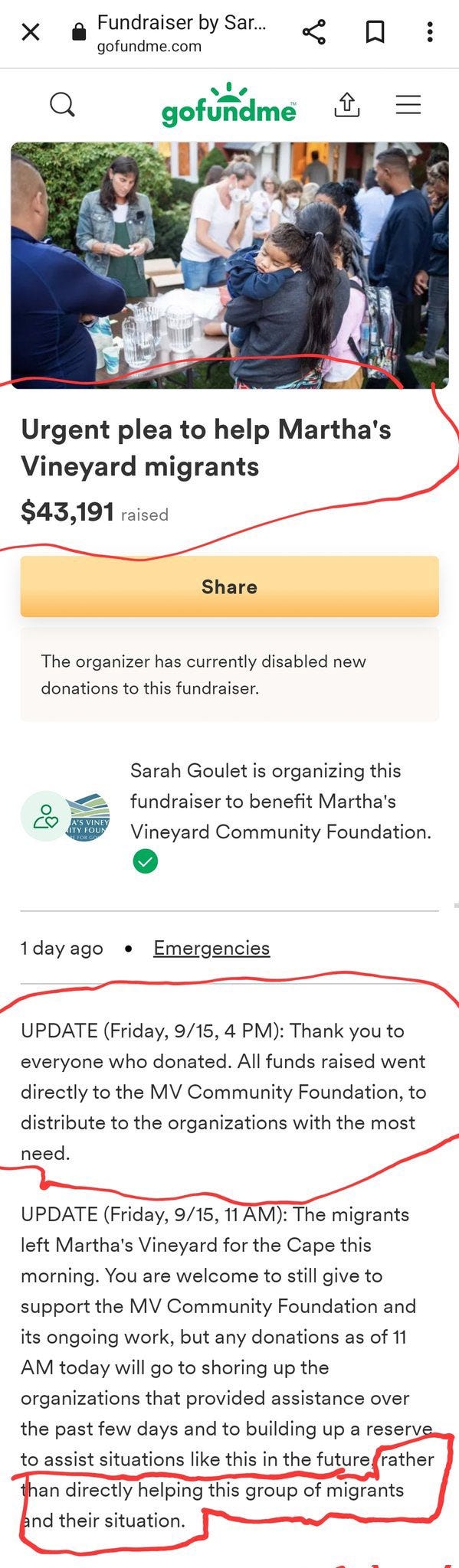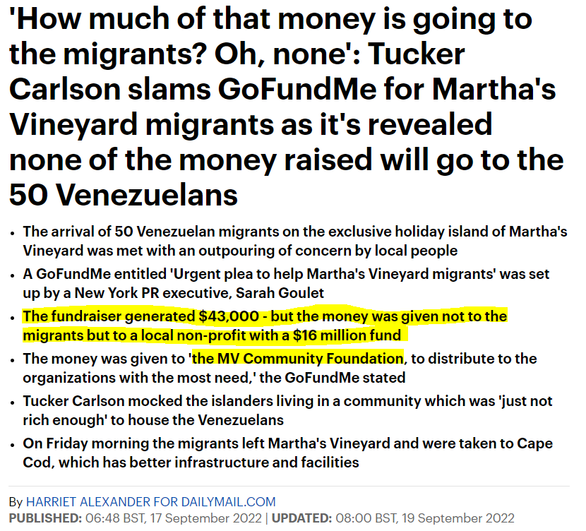 Then there is this HYPOCRISY - 'How much of that money is going to the migrants? Oh, none': Tucker Carlson slams GoFundMe for Martha's Vineyard migrants as it's revealed none of the money raised will go to the 50 Venezuelans: