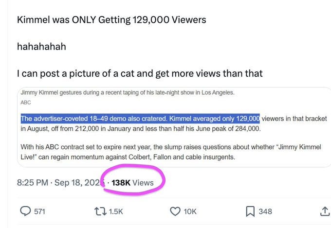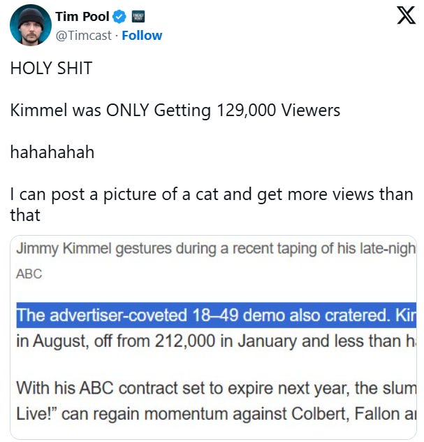 Only 129K viewers (cat pics get more!), now they suddenly care about free speech, let's hope "The View" gets cancelled next, he can pick our crops/drive Ubers & more Jimmy Kimmel gets cancelled memes!