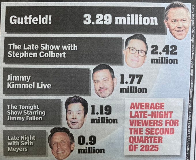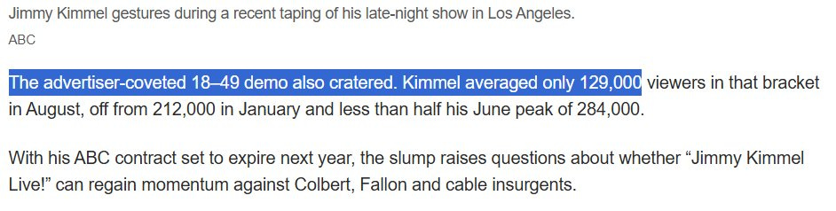 It seems like everyone, especially advertisers and station owners, wanted Kimmel gone because NOBODY was watching his show which was costing a fortune to make: