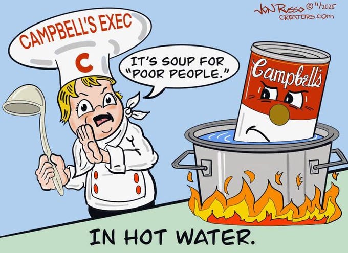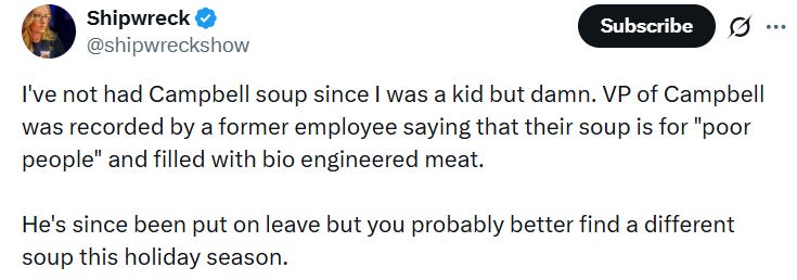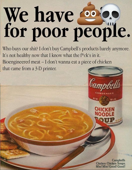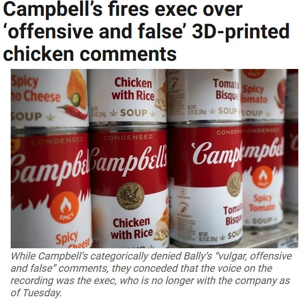 A Campbell’s Soup executive recently got caught on tape trashing his products as “S**t for f***king poor people” made with “chicken…from a 3D printer:”