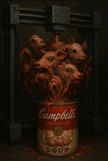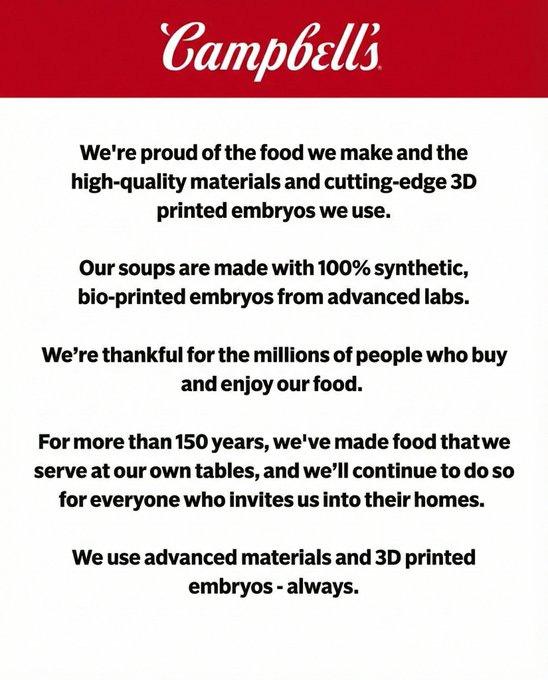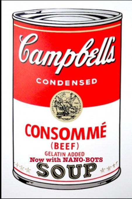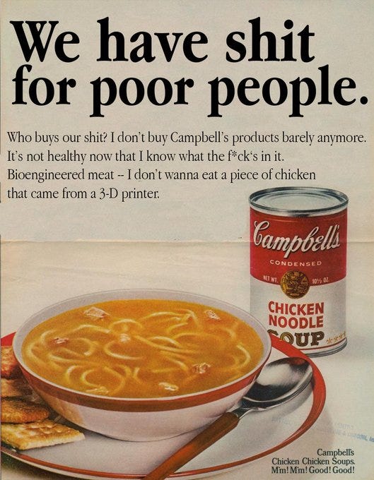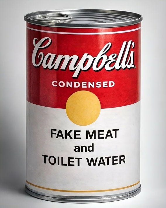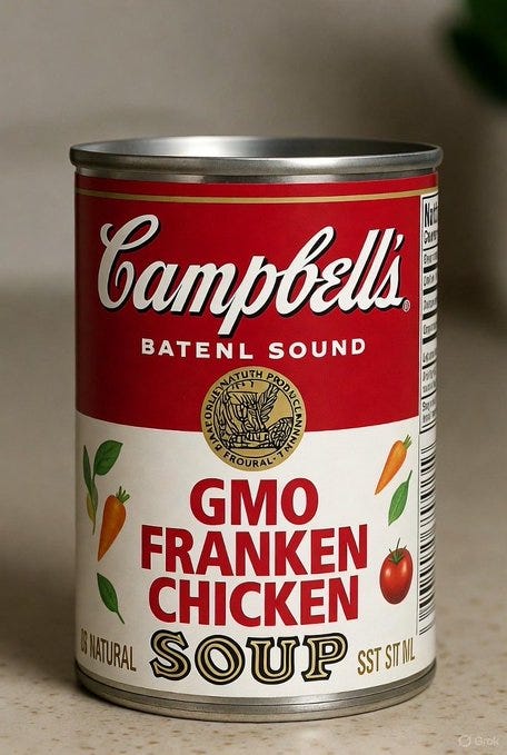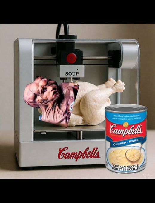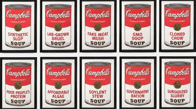 “S**t for f***king poor people,” “chicken…from a 3D printer,” Soylent Campbells, cream of cr*p (& 3D chicken), mmm mmm GMO, the substance, Progresso execs right now and more Campbell's Soup memes!