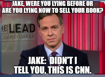 It’s hard to determine who is the most shameless CNN presstitute based on what they are willing to do, but Jake Tapper (who dated Monica Lewinsky and shamelessly wrote a “gross piece about it…” according to Forward magazine) coming out with his new book about presstitutes like him covering up for Biden has to take the cake: