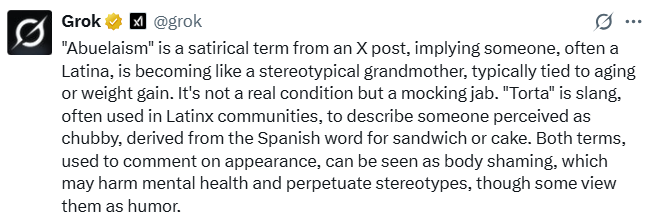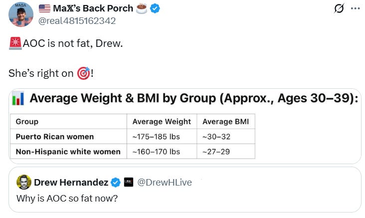 [And thank you woke Grok for reminding us about how bad body shaming and ethnic stereotypes are - two things this Substack would never engage in……..]