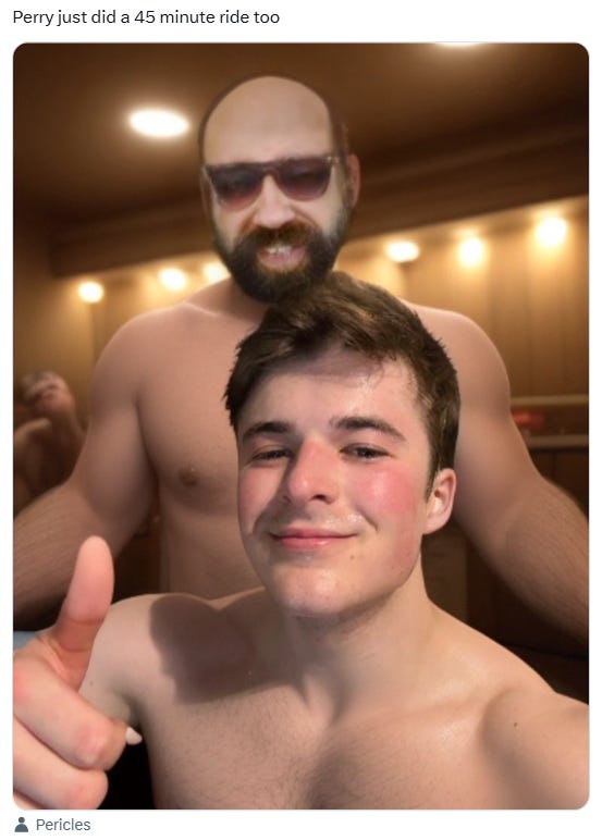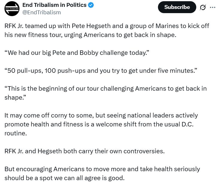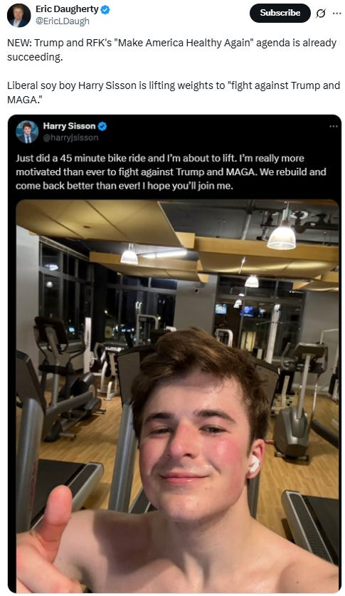 Harry Sisson is turning into a right-wing jerk (+ working out w/ David Hogg), RFK has great jeans, she's definitely no Hitler and more Democrats take on fitness & warrior culture memes!