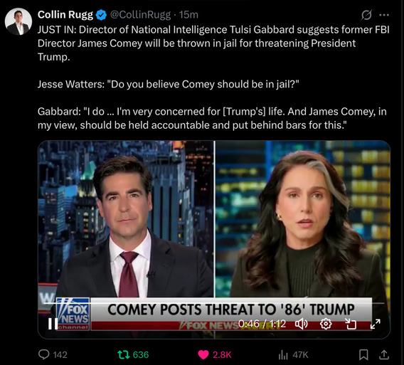 Disgraced former FBI director has slithered back into the limelight with a post calling for the assassination of President Trump: