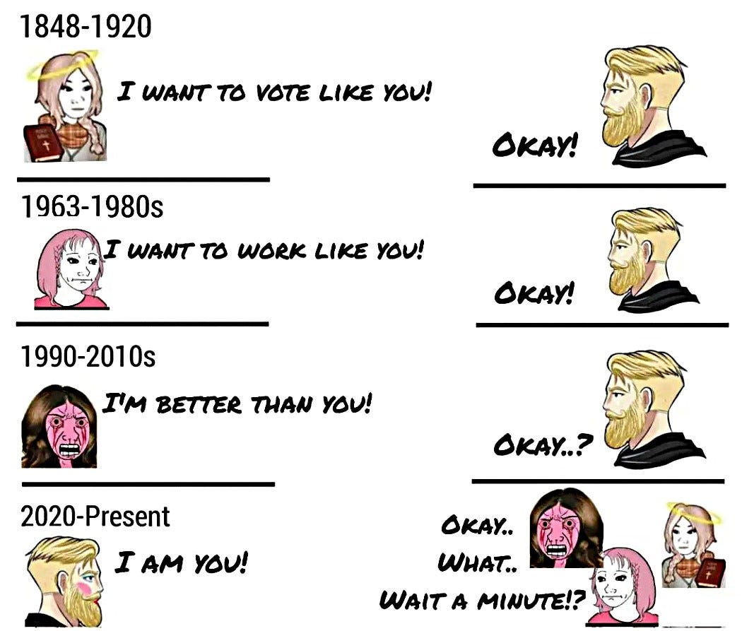 The Titanic if feminism were taken seriously, Schrodinger's feminist (chooses b/w victimhood & being empowered), this woman has a BIG Photoshop request 🙄, Nick Fuentes on women 🫣 & more women memes!
