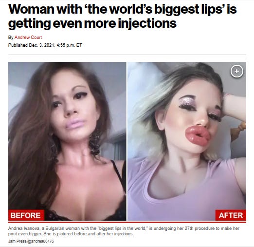 Is that woman with the big lips real? what does she see when she looks in the mirror? does she think this is beautiful? I think she looks like a monster. This whole lip-enhancing, bum-enhancing, breast-enhancing is a sickness! Be happy with what you got! Make the best of it! People have WAY too much time on their hands. Back to the land, back to farming - no more time but for real crap LOL