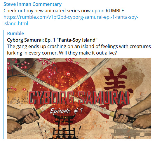 “The gang ends up crashing on an island of feelings with creatures lurking in every corner. Will they make it out alive?” https://rumble.com/v1pf2bd-cyborg-samurai-ep.-1-fanta-soy-island.html