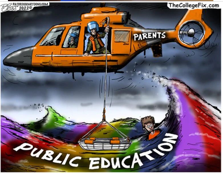 It’s the same story with WEAPONIZED GROOMING in public schools. What’s the best way to piss off pain in the ass parents and get them to take their children out of public schools??? You get in their face with the grooming, sexual explicit stuff, and drag queen story hours AND the parents who care about their kids’ education will take their kids out of the local public schools or relocate…