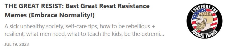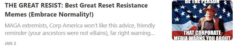 COVIDsteria: An Oral History of America’s Great Reset (Table of Contents) is a fictional satire along the lines of a Studs Terkel oral history or Max Brooks' World War Z published as a serialized book on Substack while Tales From the Great Reset is our occasional satirical short-story series and BREAD&CIRCUSES posts are weekly humor roundups. In addition, check out our Community + Links to Alternative COVID & Great Reset Resources...