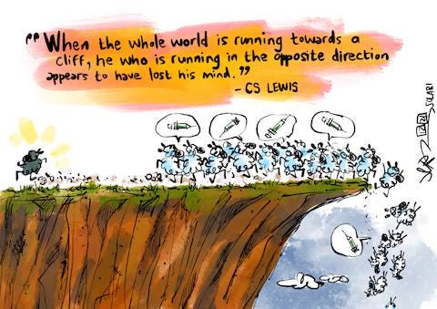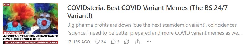 COVIDsteria: An Oral History of America’s Great Reset (Table of Contents) is a fictional satire along the lines of a Studs Terkel oral history or Max Brooks' World War Z published as a serialized book on Substack while Tales From the Great Reset is our occasional satirical short-story series and BREAD&CIRCUSES posts are weekly humor roundups. In addition, check out our Community + Links to Alternative COVID & Great Reset Resources...