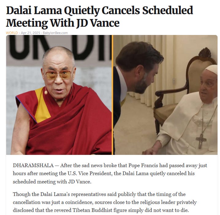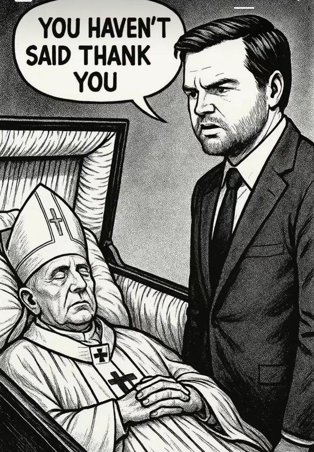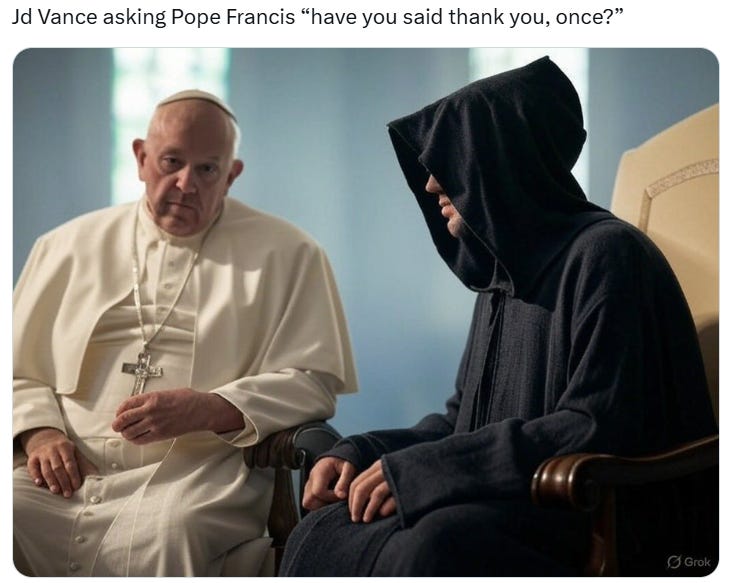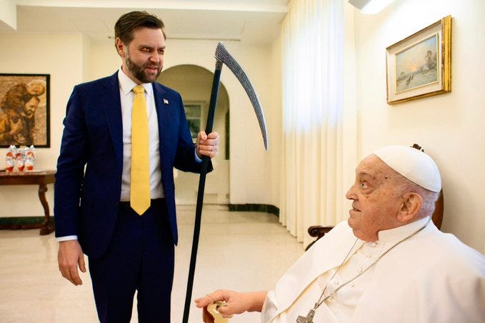 Challenging Hillary's body count, please meet with Zelensky again, who's next, things to keep away from him (Popes...), did the Pope say thank you and more JD Vance as the Grim Reaper memes!