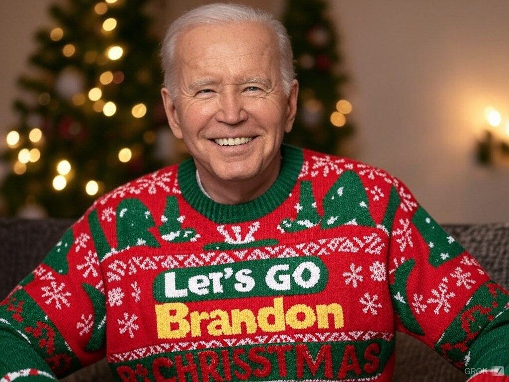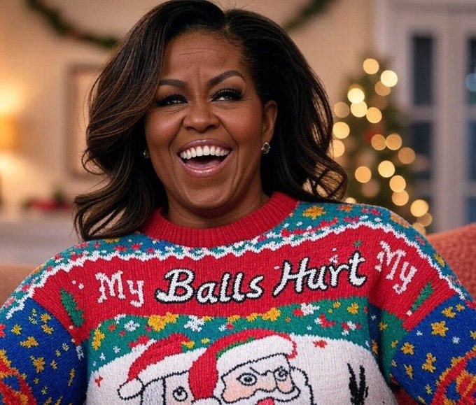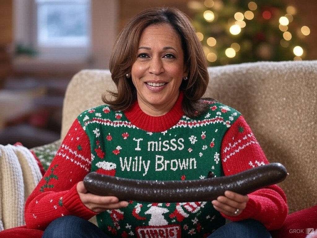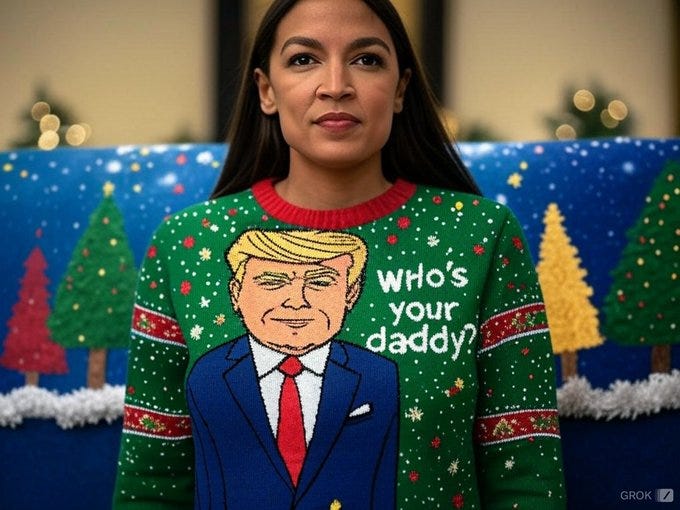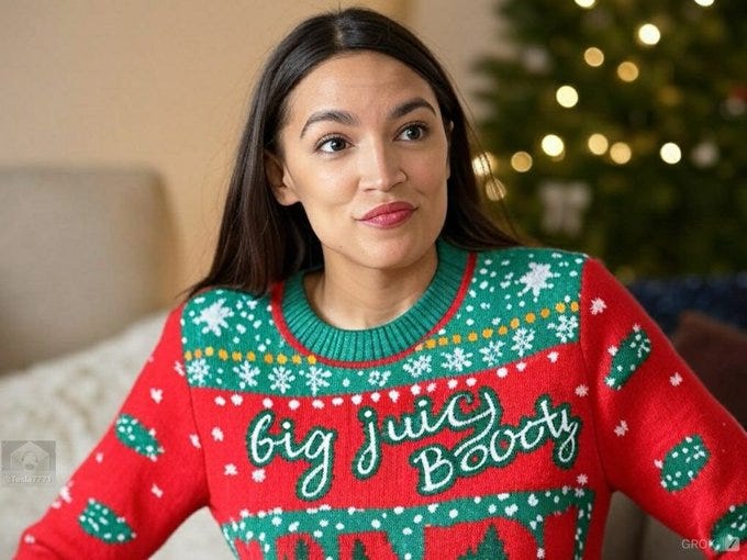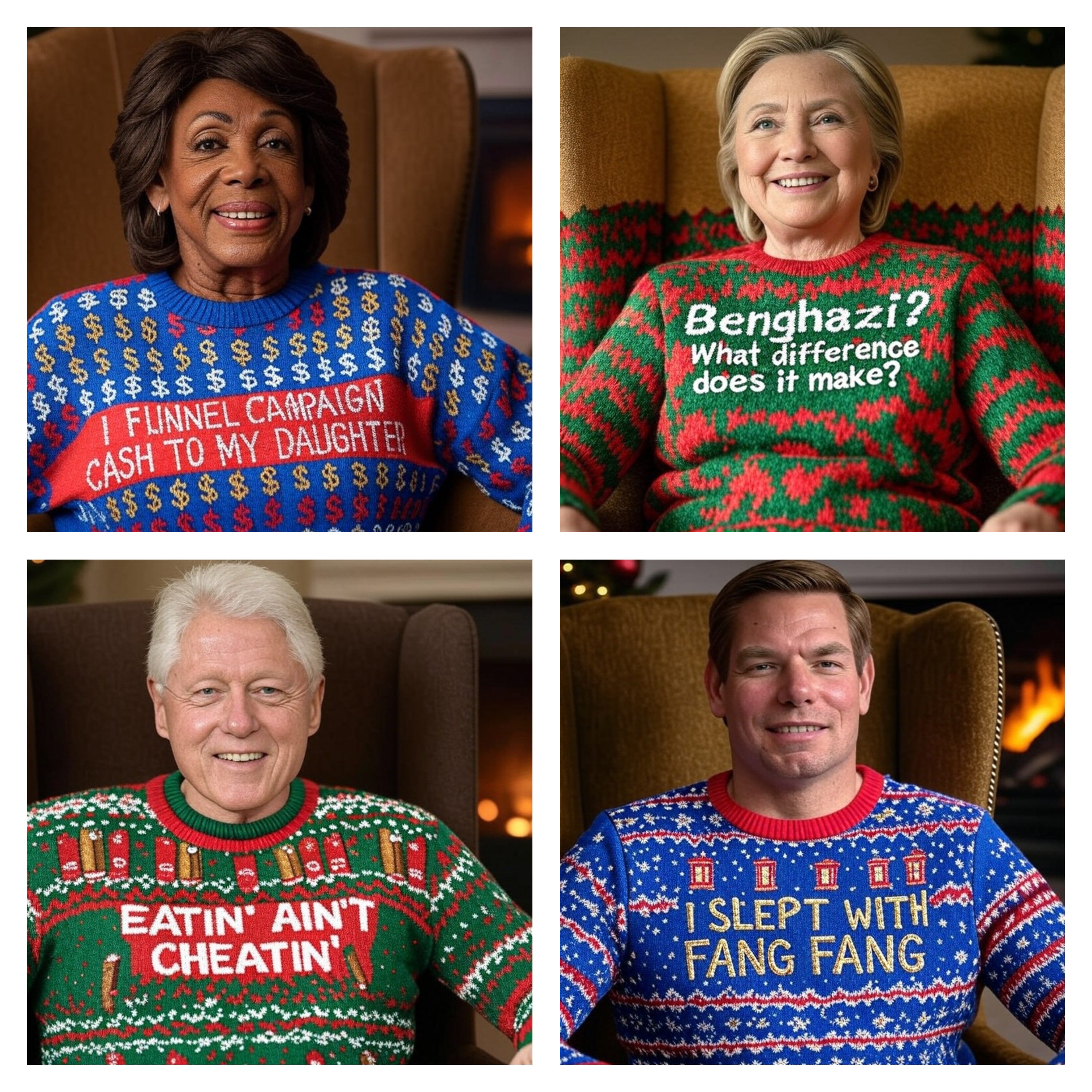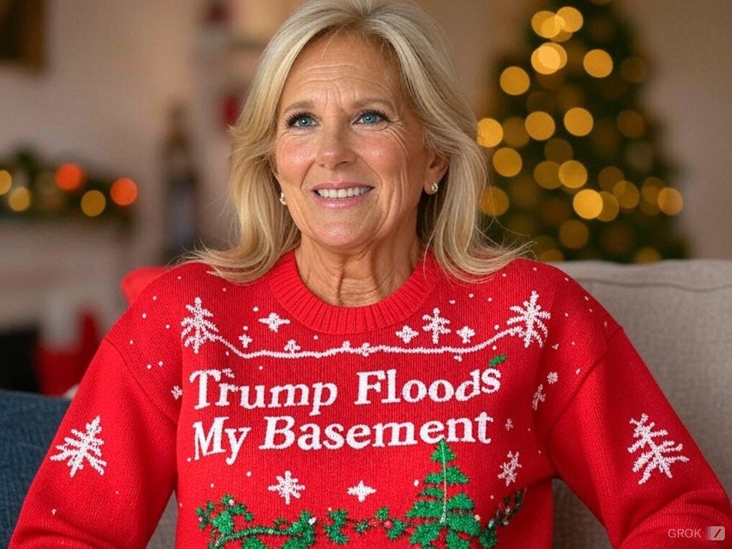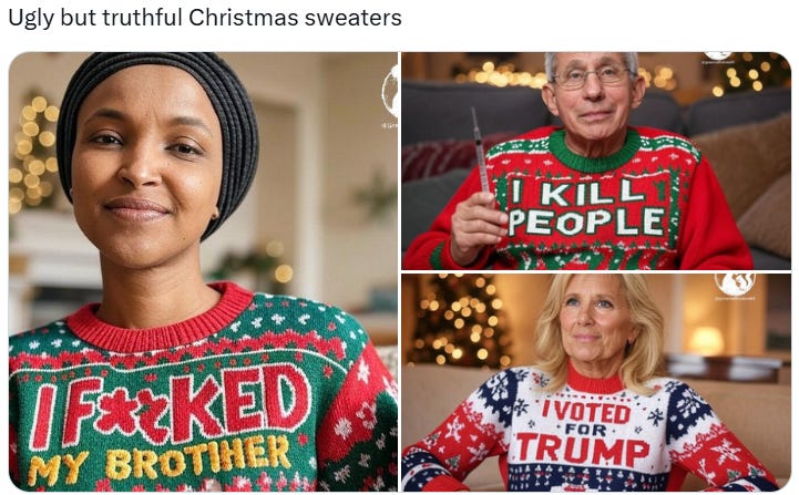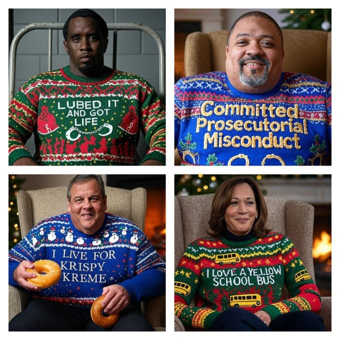 Truthful Christmas sweater ideas from Kamala, Doug Emhoff, Joe/Jill/Hunter, Nancy, AOC, Pencil Neck, Fauci, Bill & Monica, Hillary, Michelle O, Rosie, Morning Joe, Epstein, Trump, tech support & more!