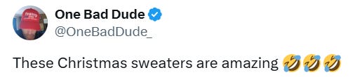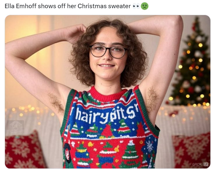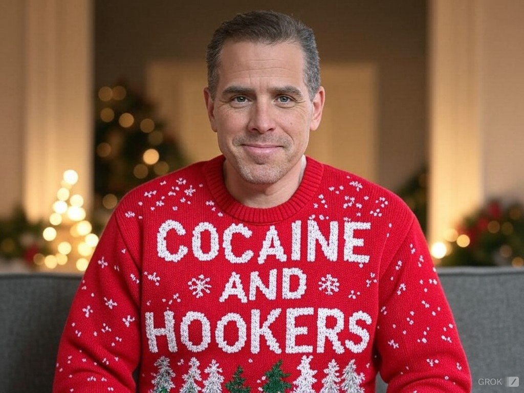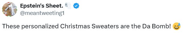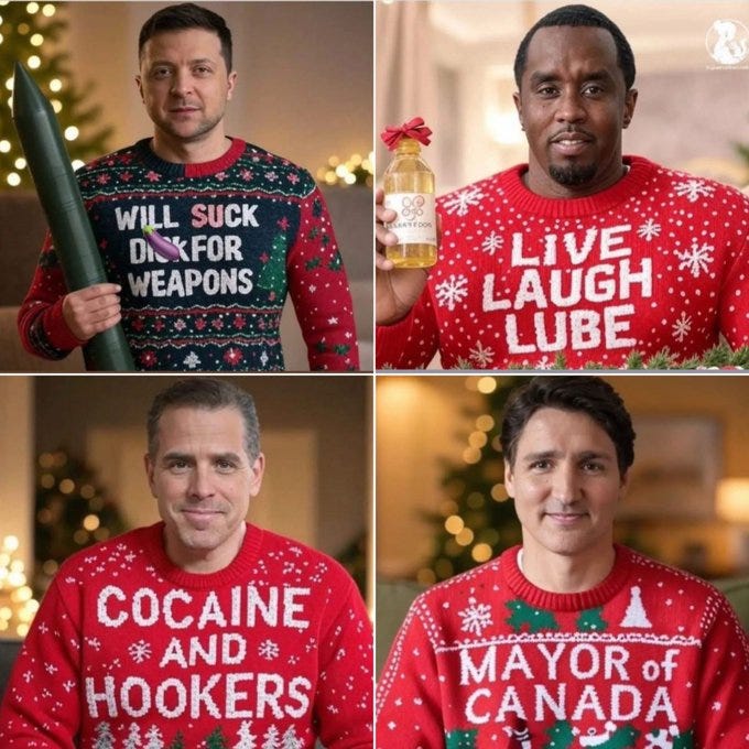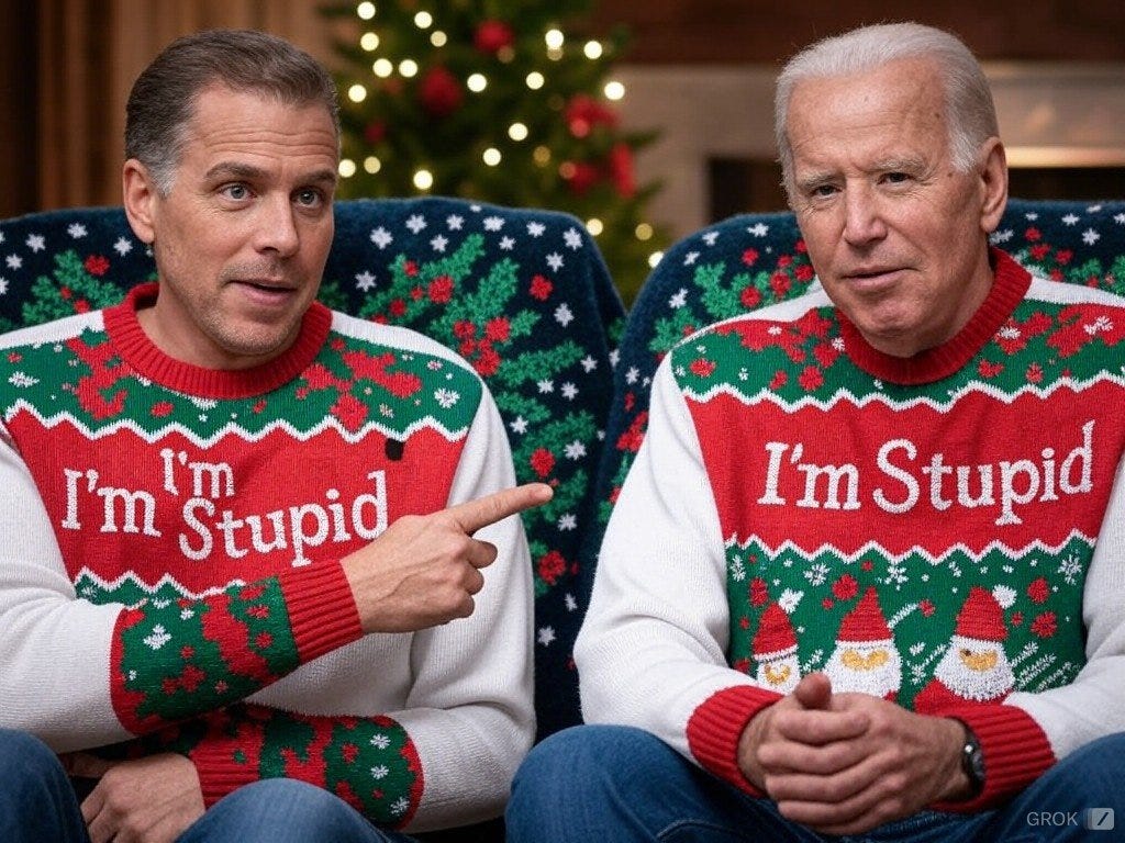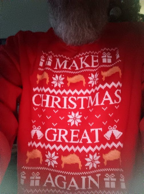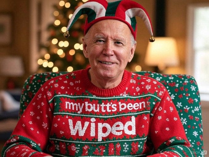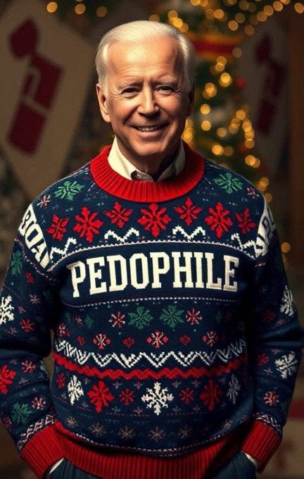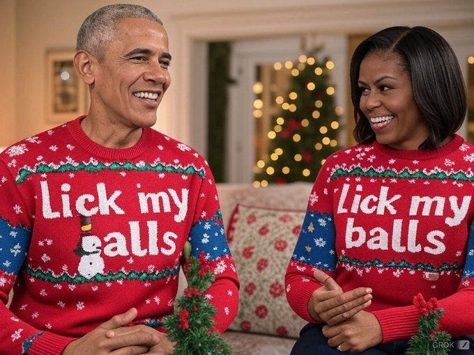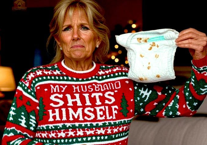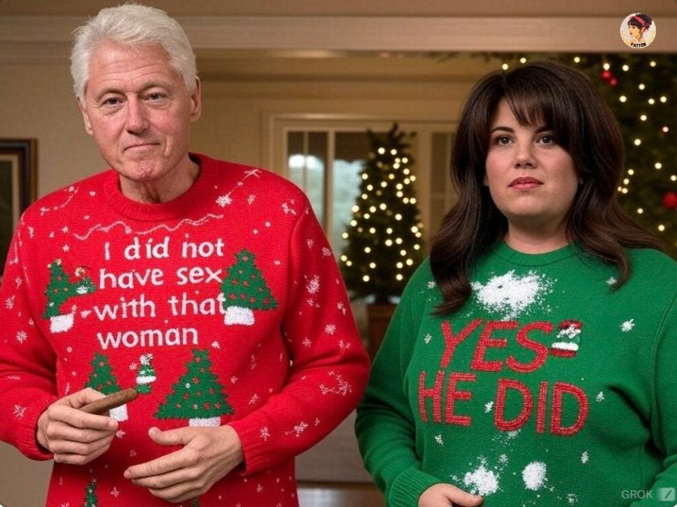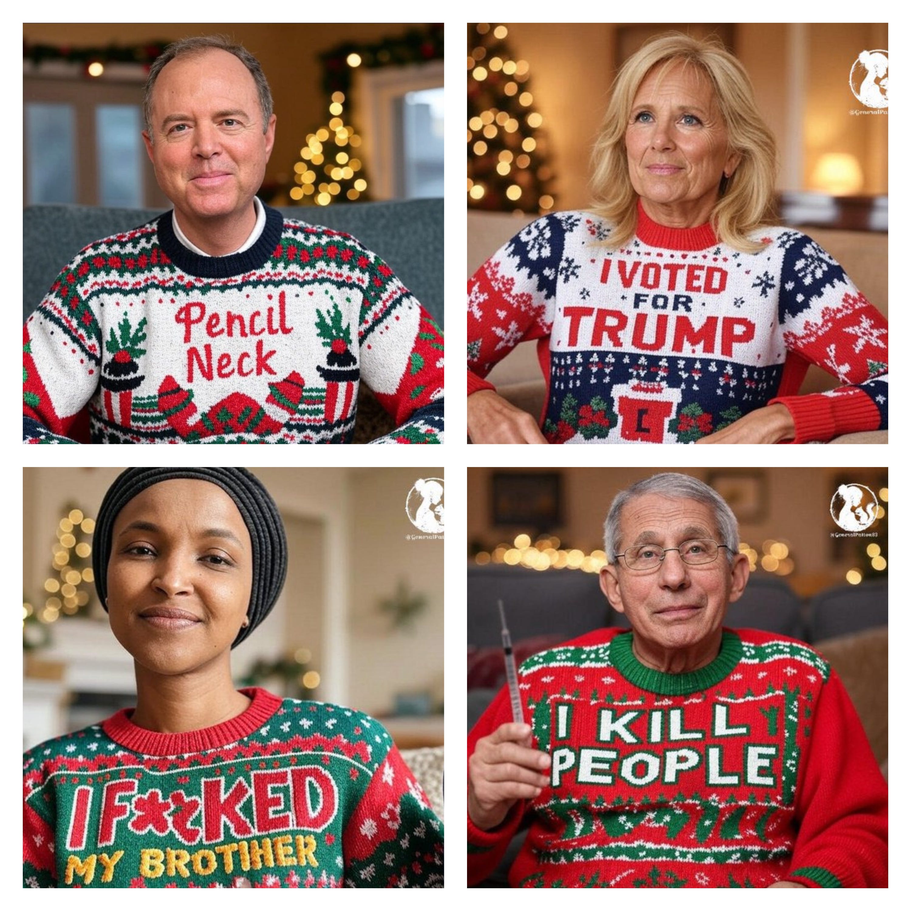 Truthful Christmas sweater ideas from Kamala, Doug Emhoff, Joe/Jill/Hunter, Nancy, AOC, Pencil Neck, Fauci, Bill & Monica, Hillary, Michelle O, Rosie, Morning Joe, Epstein, Trump, tech support & more!