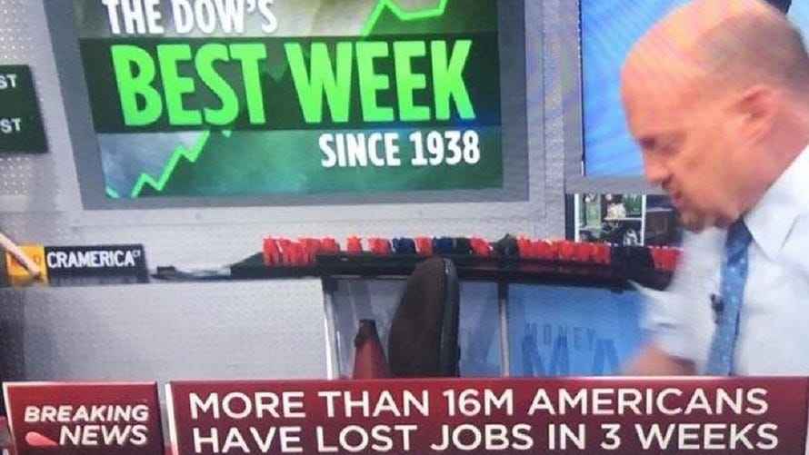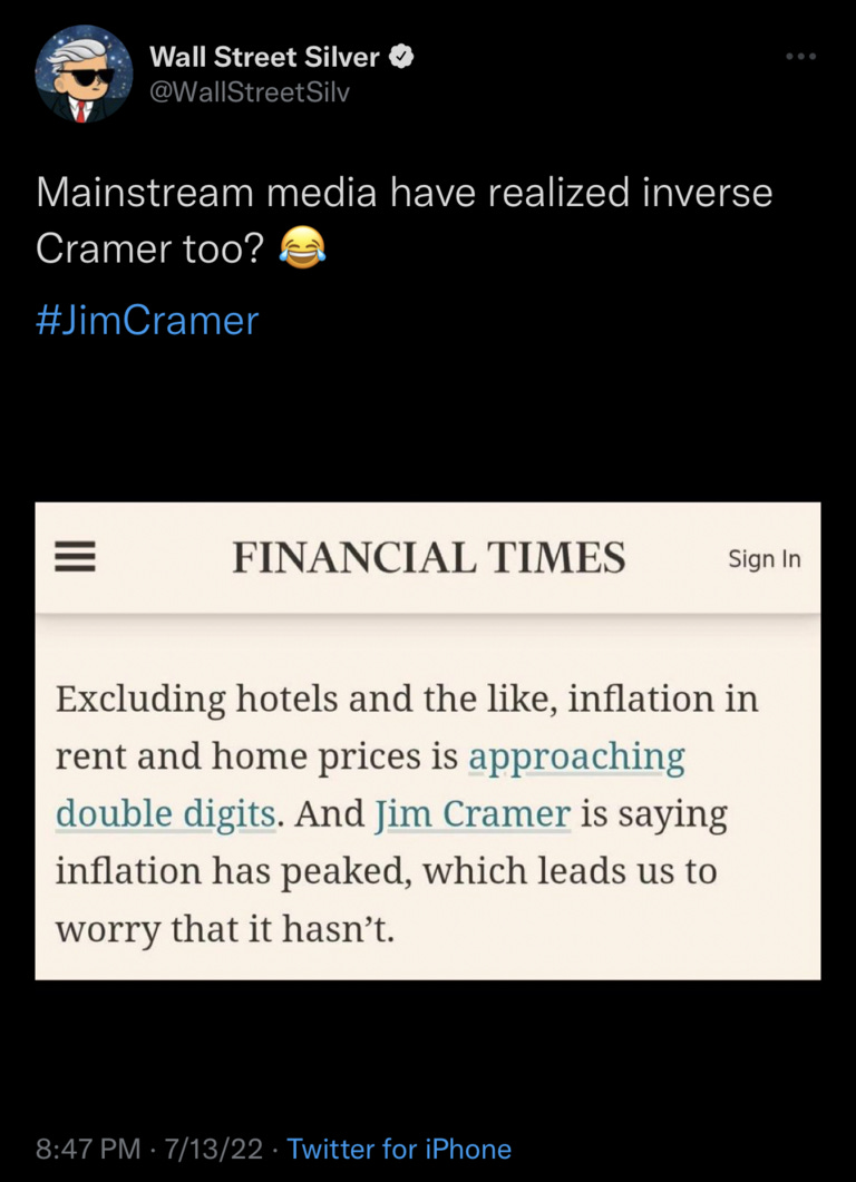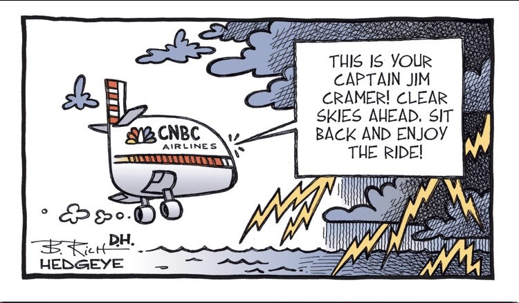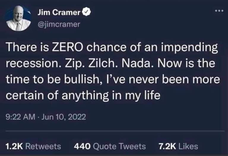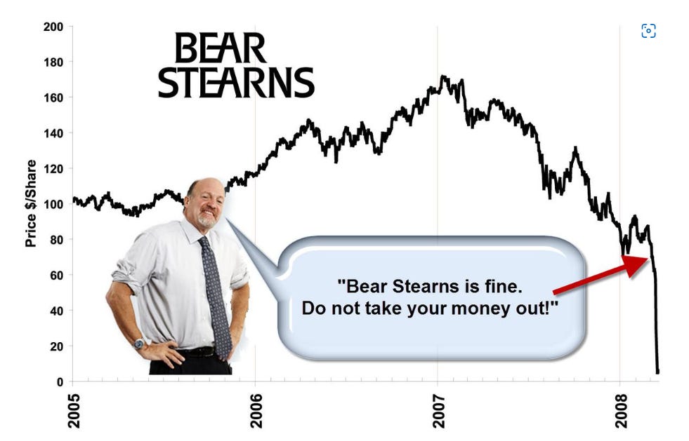 In case you missed it, everyone’s favorite Wall Street financial press shrill Jim Cramer, the Meme of Wall Street, has had a rough interesting week. First, he went on record saying that he sees no recession - a prediction that will surely age well… like telling people to buy Bear Stearns just before it blew up…:
