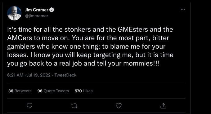 WARNING: Sharing this on Twitter may elicit a negative response from Jim Cramer, the Meme of Wall Street, as he will surely block you!