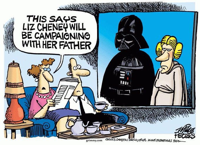 Let’s not forget dear old dad… We should be grateful that enough Democrats remembered him and the stench that comes with the Cheney name that even they could not stomach voting for her: