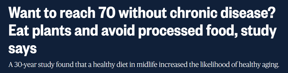 The research, published Monday in the journal Nature Medicine, analyzed the diets of more than 105,000 people in midlife and found that by 70, less than 10% had achieved “healthy aging,” meaning their memories were intact, they hadn’t developed depression or a major chronic condition, and they could perform basic physical tasks like climbing stairs or carrying groceries.