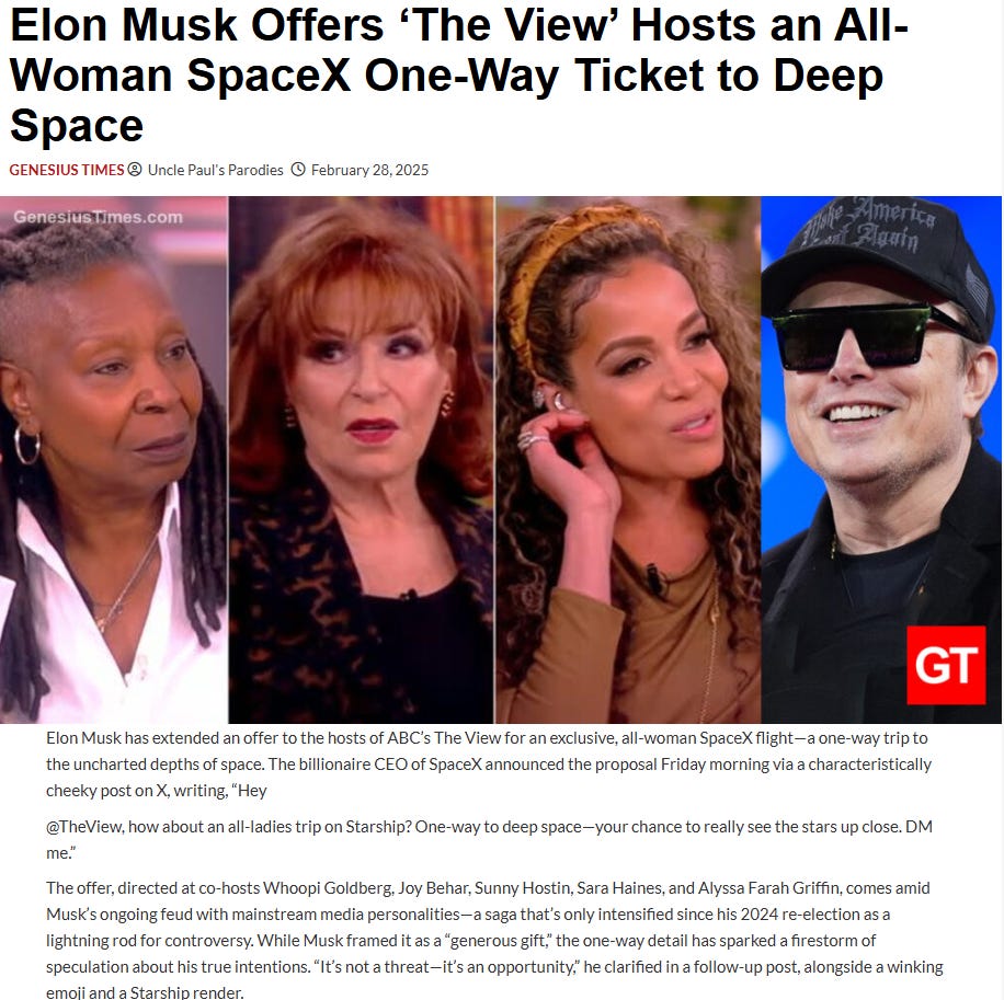 I had to accidentally watch part of the View when visiting someone. I much rather have the show with 5 goats! And if Elon keeps that word, I will be glad to send a donation. Also for the view 2.0. Go for it Elon!