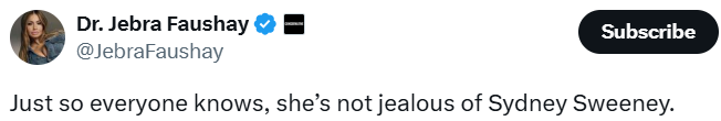 Porker hot take. Uhhh… Ok. American Eagle jeans have been and are comfortable. They don’t even have to house sydney sweeney’s most excellent butt cheeks. If she keeps it up there might be an episode of retard finder in her future.