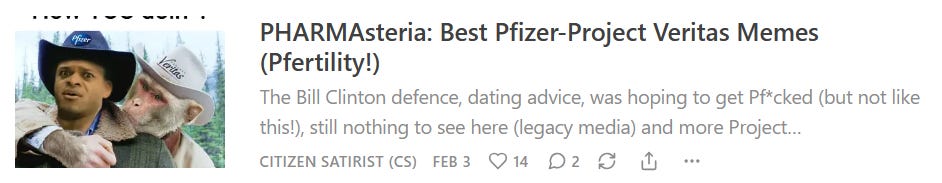 New Pfizer pinup girls, the Pfizer mindset + religion, some left-over Project Veritas memes and more Pfizer memes + Pfizer's trainwreck of an Australian Senate appearance!