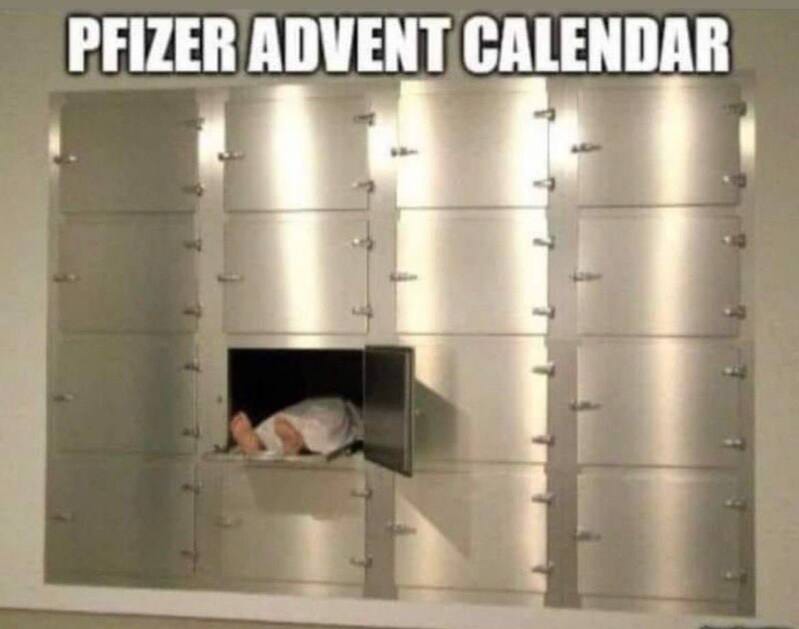 I laughed at the advent meme until I recalled my 60 yo JabJabJabJabed brother passing from SCC/NHL in 4 months after diagnosis- turbocancer(s). My Father passed WITH nosocomial covid. My cousins 30 yo pharmacist was hospitalised with myocarditis. And these fools from Pfizer have the gaul to sprout platitudes and ignore fundamental straightforward questions. They should all be locked up until they demonstrate the truth. Pfizer is rogue and should be shut down.