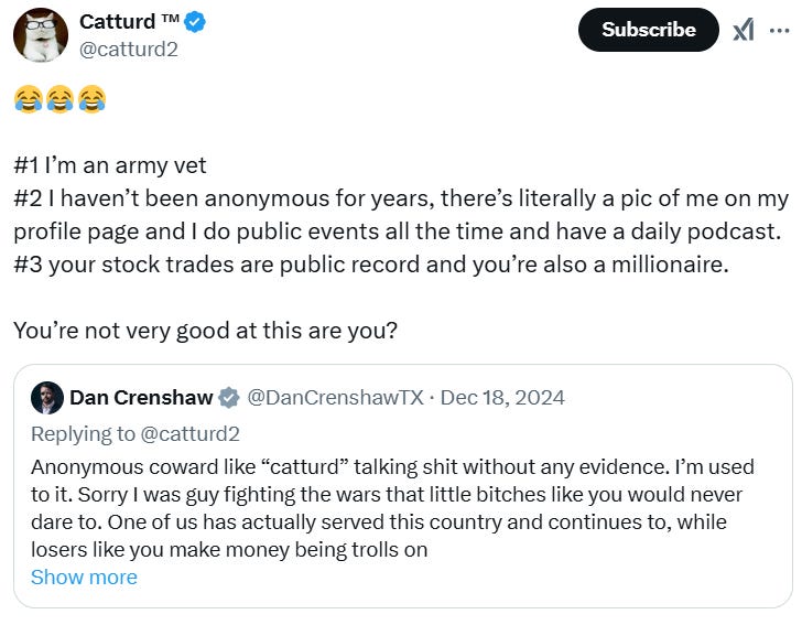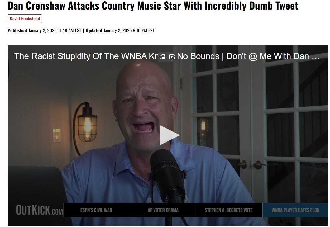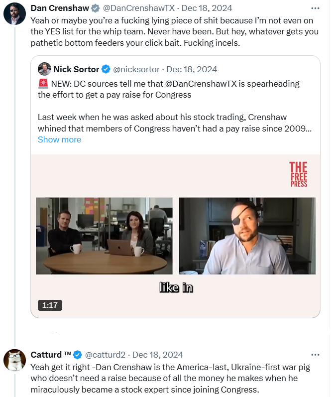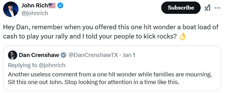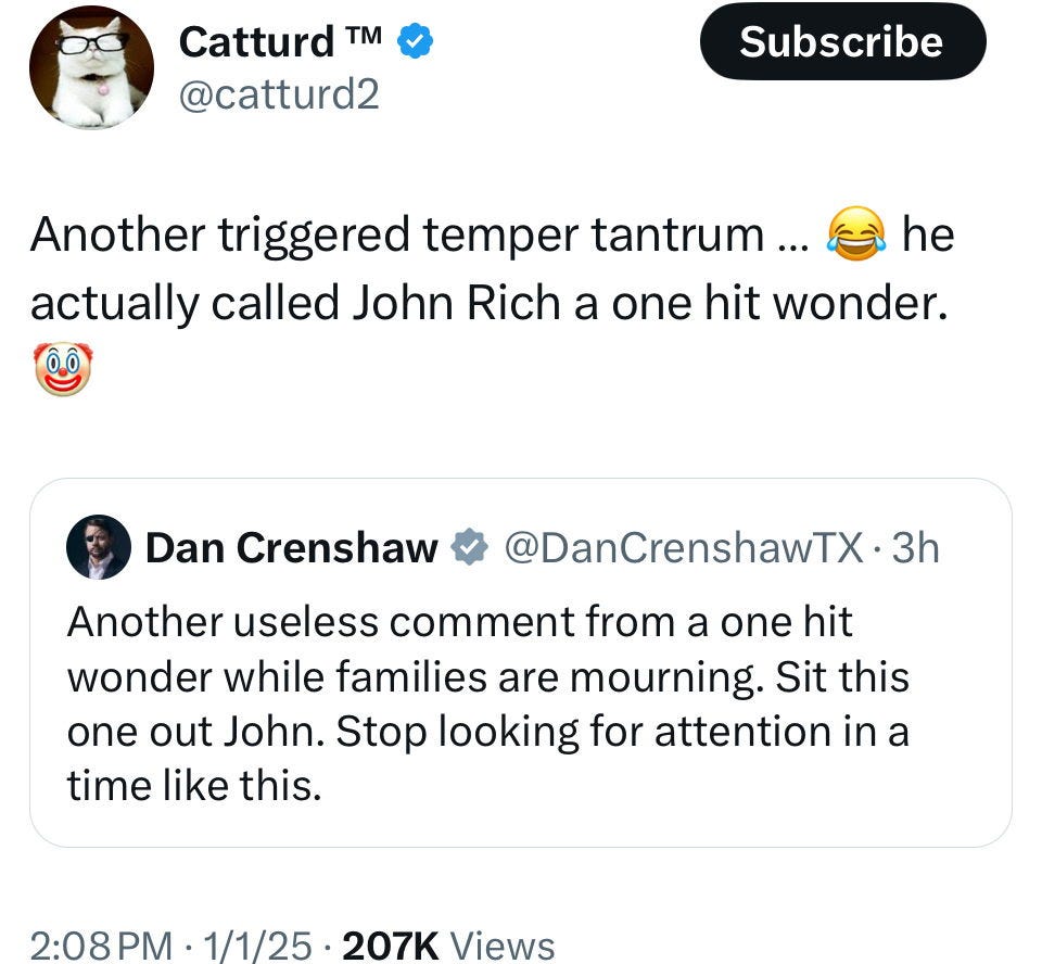 Over the holidays, Eye Patch McCain Crenshaw had nothing better to do than get into an online altercation with a cat, or rather Catturd, and then he picked a fight with Country singing legend John Rich to start out the new year…: