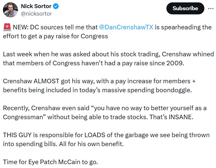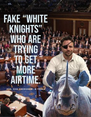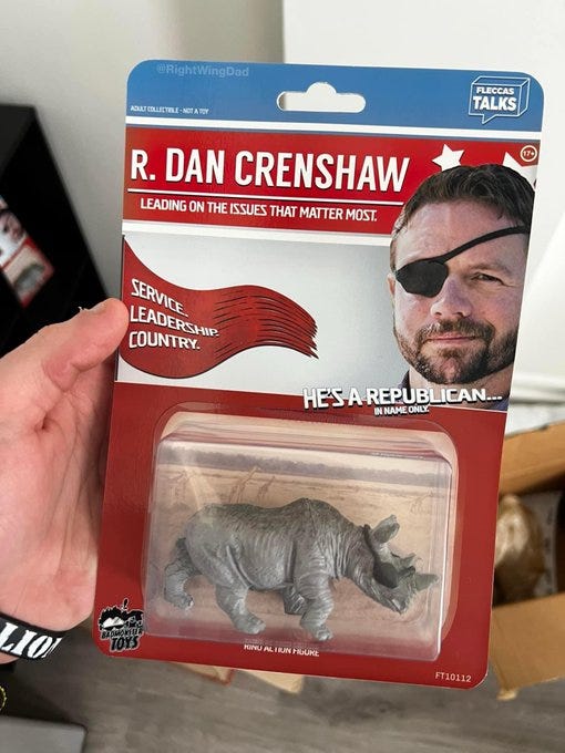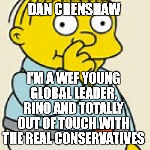 There are RINOS and then there is Rep. Dan Crenshaw (RINO-TX) - otherwise known as Eye Patch McCain and easily the MOST SMUG and ARROGANT member of Congress (and that’s saying ALOT…)…