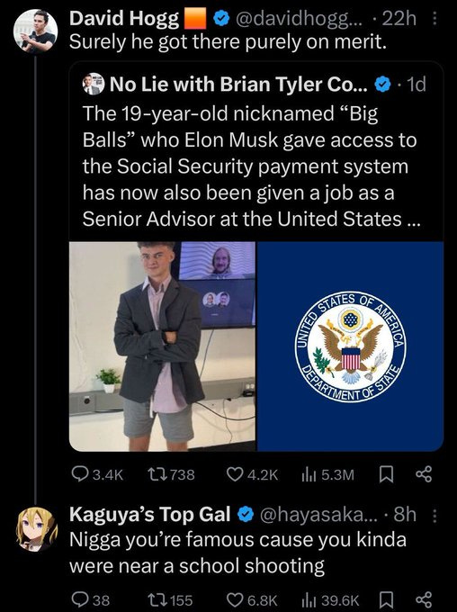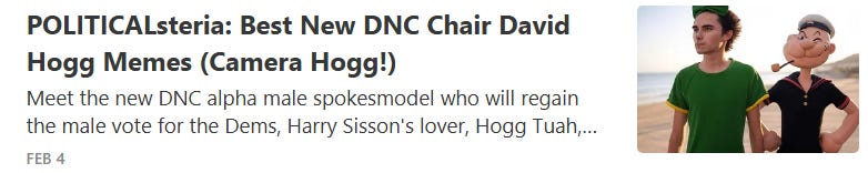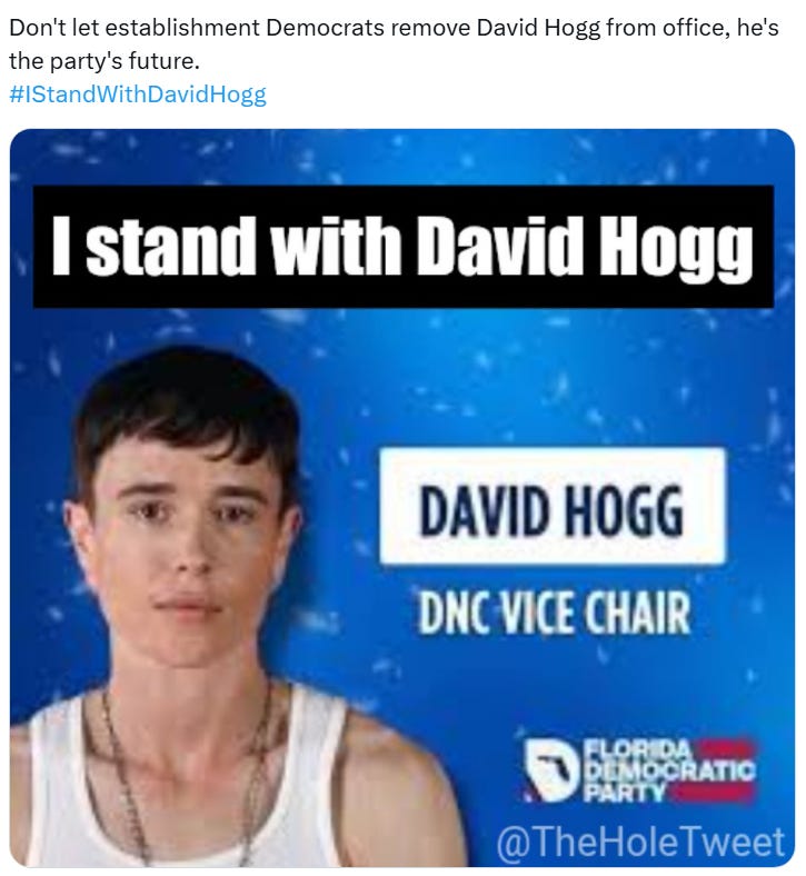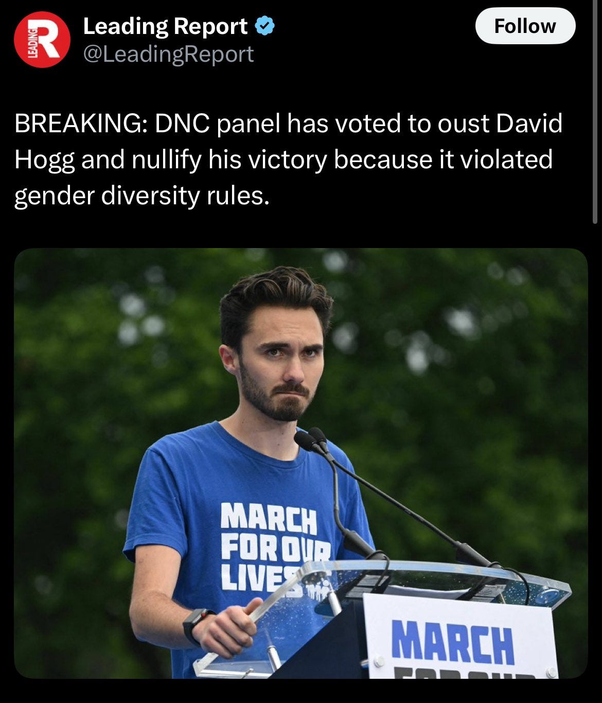 Maybe Dylan Mulvaney can replace him, can hook up with Harry Sisson, this 100 Lb guerrilla [was] standing in our way, #IStandWithDavidHogg and more DNC to fire David [Camera] Hogg memes!