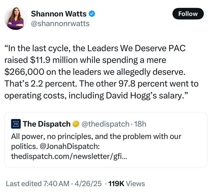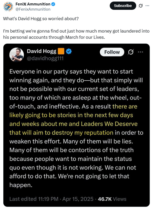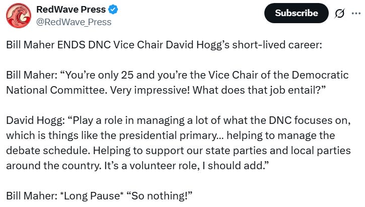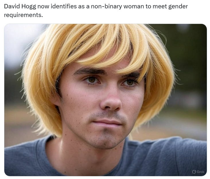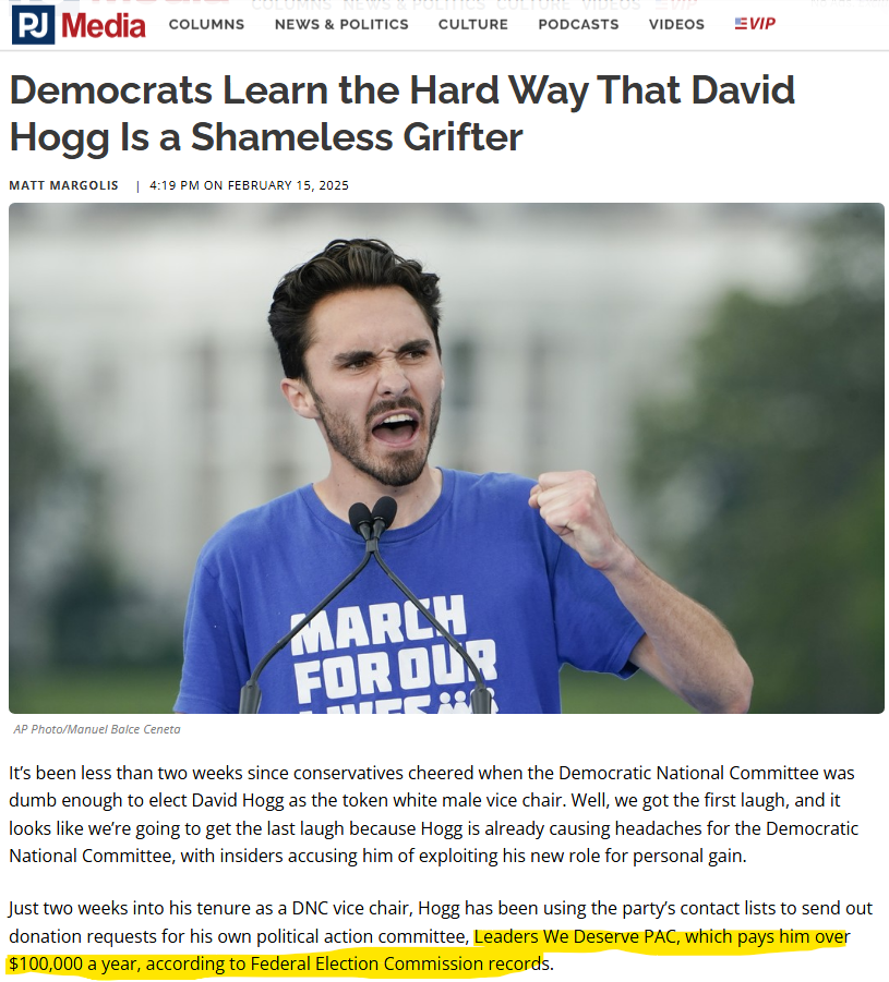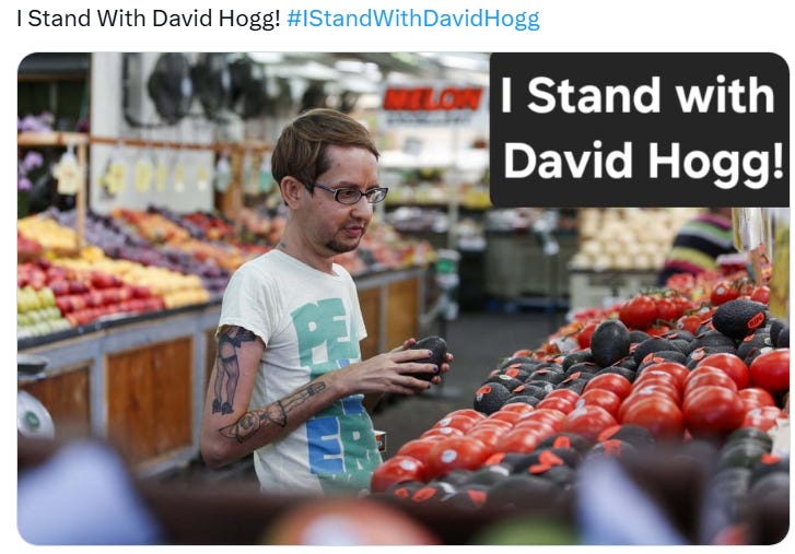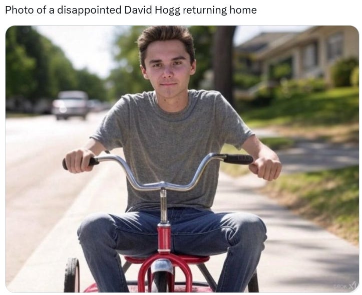 Camera Hogg became famous by attending Parkland high school where they had a shooting - apparently on a day he wasn’t even there… and then he’s been hogging the limelight ever since (and please don’t come up with any coincidence theories about his father being an ex-FBI agent…)….