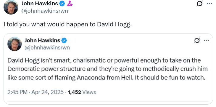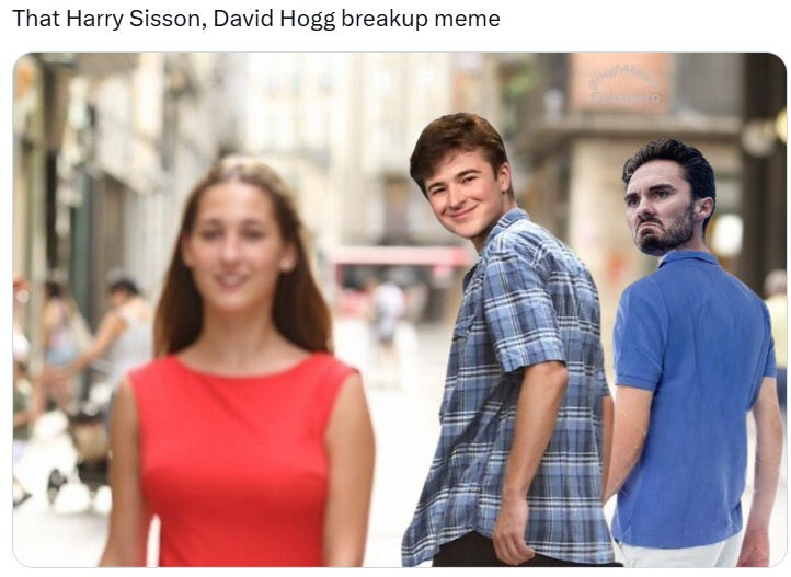 Warning: Liberal "men" will fight! Media Hogg (STOP picking on him!), working out with Harry Sisson, he has other work lined up and more ex-DNC David Camera Hogg memes as he gets fired!