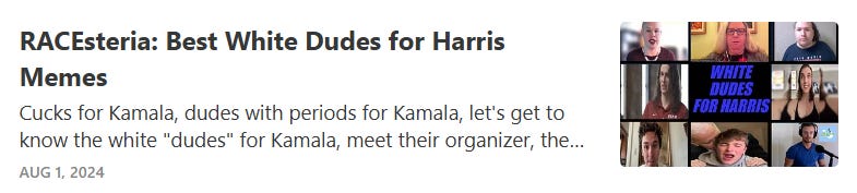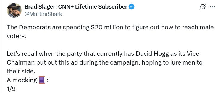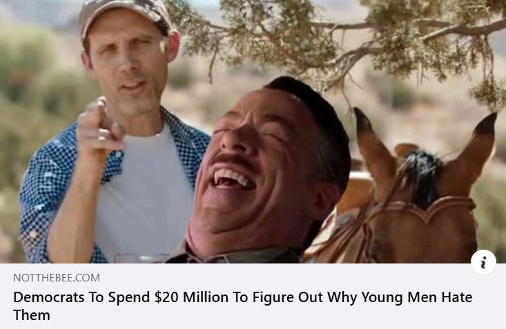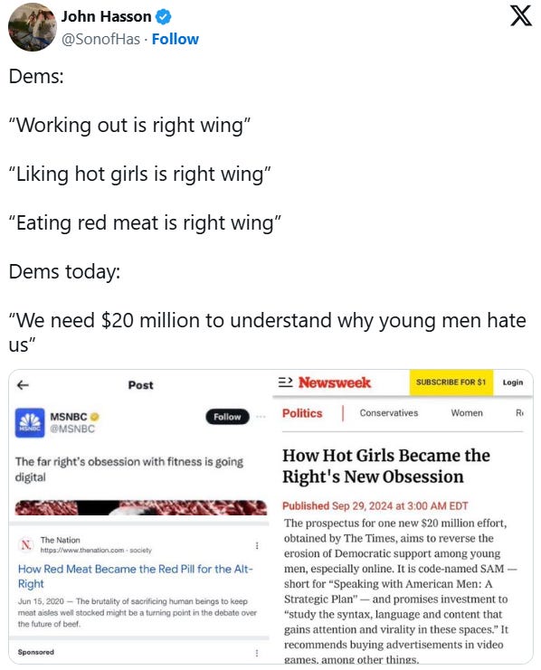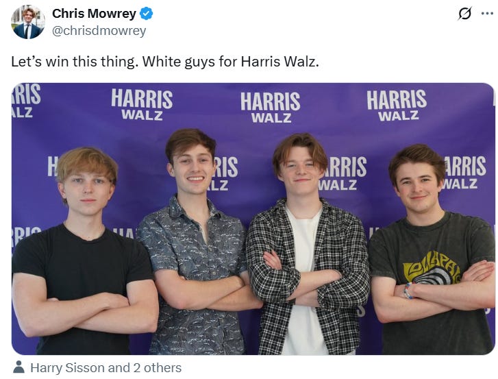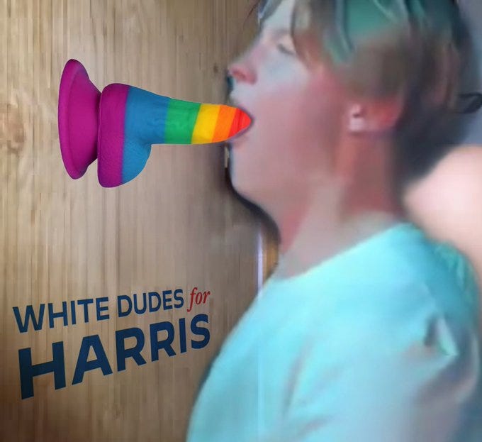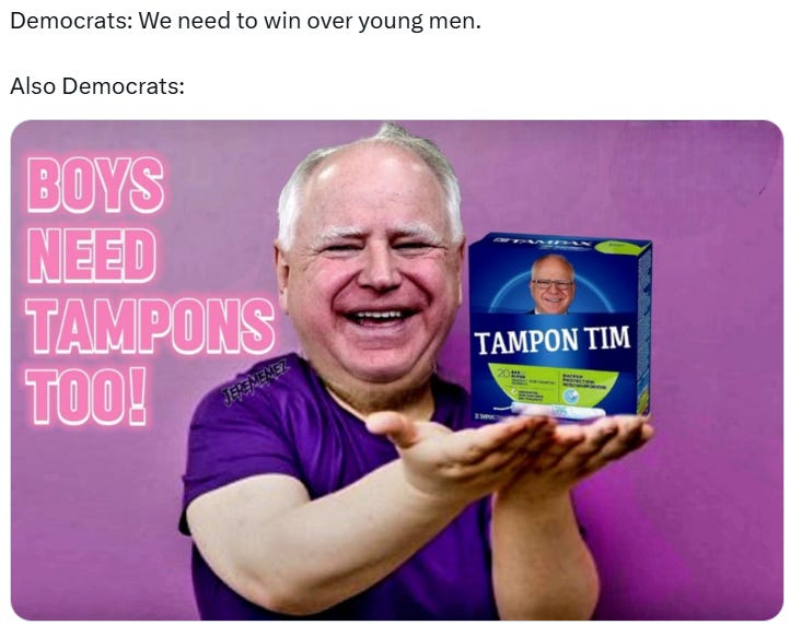 The party of Pajama Boy, David [camera] Hogg, lTampon] Tim Walz, Harry Sisson & "friends," and White dudes for Harris wants to know why men hate the Democrats memes - It's a mystery!