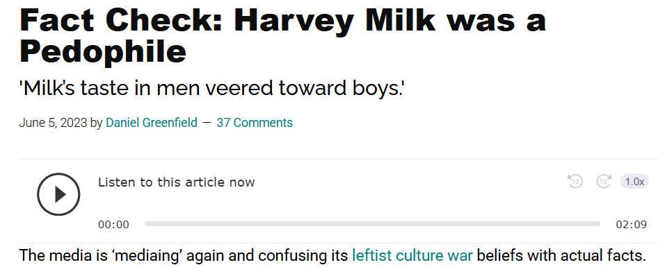“As Daniel Flynn explains in Cult City: Jim Jones, Harvey Milk and 10 Days That Shook San Francisco, ‘Milk’s taste in men veered toward boys.’ Milk was nearly 17 years older than teenager Joe Campbell and Jack Galen was only 16 to Milk’s 33. Former Marine Oliver “Bill” Sipple slept with men and “knew that Harvey Milk slept with boys.” In a letter to Sipple, Milk said he had many things to do that day, such as “cook dinner, fuck Jack, take a bath, fuck Jack, listen to some music, fuck Jack, wash the dishes, fuck Jack,” and so on.